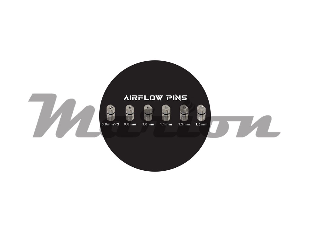 Přímo v základně se nachází airflow pin pro vstup vzduchu ke spirálce. Výhodou modelu Labs MTL RTA je přítomnost celé řady airflow pinů, které lze jednoduše měnit, můžete si tak vyzkoušet všemožné variace MTL potahu a přizpůsobit si potah přesně svým představám. V základním balení na vás čekají airflow piny s průměry vzduchového otvoru v následujících konfiguracích - 0,8mm, 1,0mm, 1,1mm, 1,2mm, 1,5mm a 2x0,8mm.