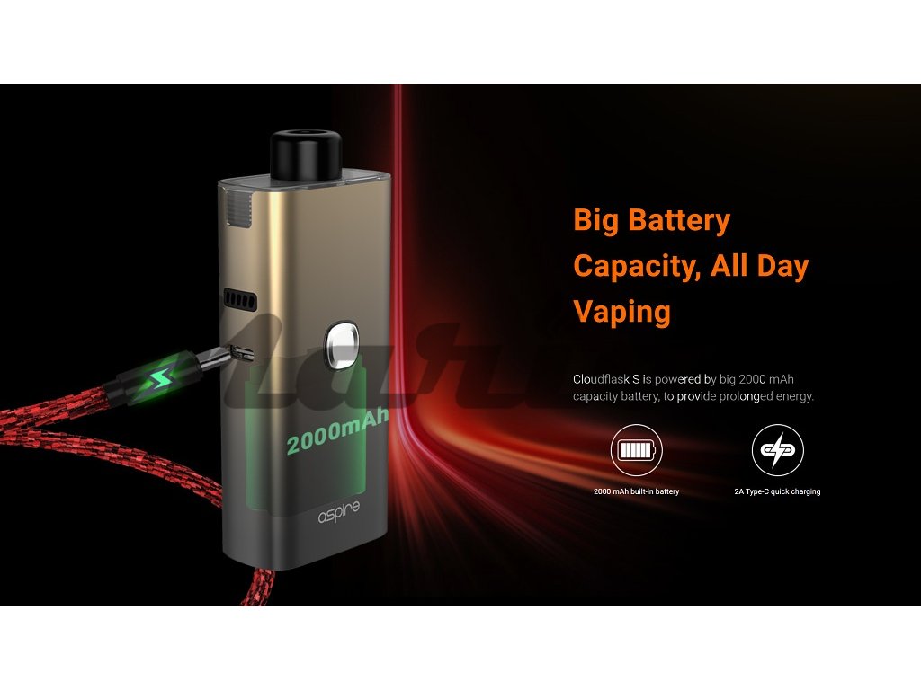 Cloudflask S je vylepšením revolučního sub-ohmového pod systému Aspire Cloudflask. Jednoduchý a snadno použitelný pod systém s vyměnitelnými žhavícími hlavami, který je navržen tak, aby produkoval ještě více páry. Cloudflask S disponuje integrovanou interní baterií s kapacitou 2000 mAh. Tato vysoká kapacita zaručuje bezproblémové celodenní vapování. Objem Pod cartridge 2ml, rychlé USB-C nabíjení, LED indikace stavu nabití. Bezpečnostní ochrana čipové sady Aspire ASP, 2x žhavící hlava v SETU. Tato cigareta je vhodná pro DL vapování.