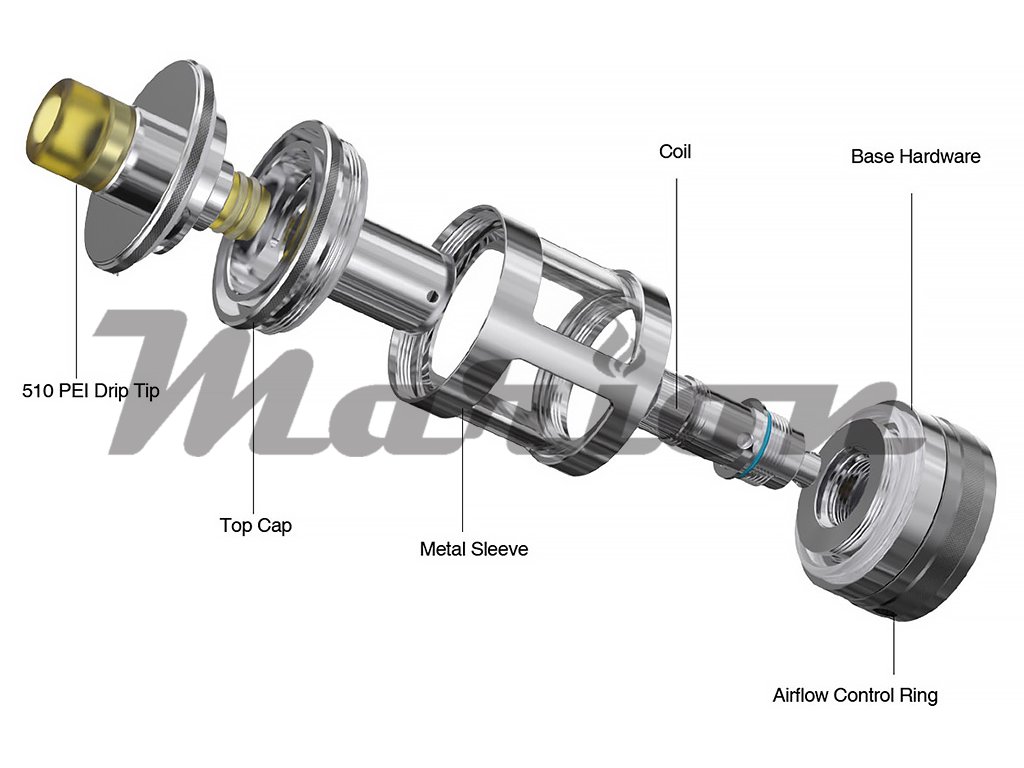 Prvotřídní MTL Clearomizer z nerezové oceli o celkovém objemu 4,2ml, horní plnění, regulace přívodu vzduchu, podpora žhavících hlav Aspire BVC, závit 510, 2x žhavící hlava v Setu.