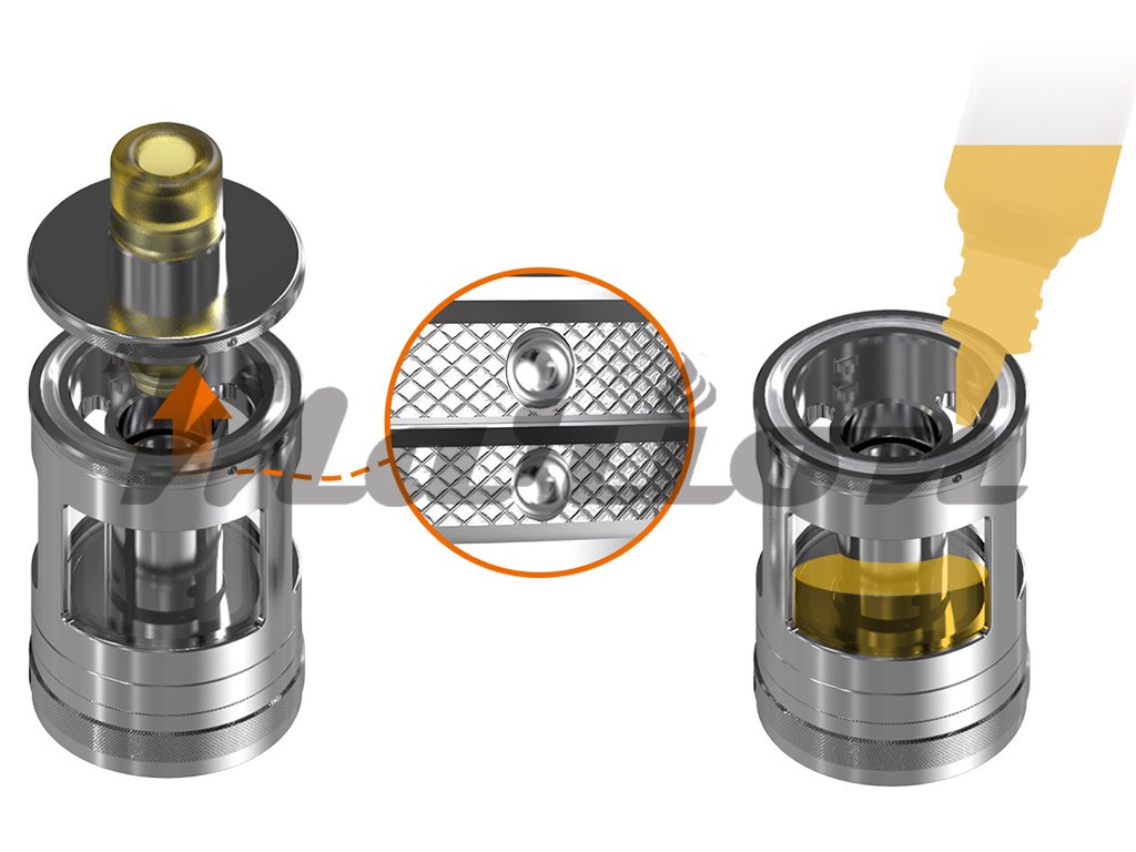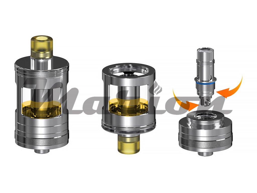 Prvotřídní MTL Clearomizer z nerezové oceli o celkovém objemu 4,2ml, horní plnění, regulace přívodu vzduchu, podpora žhavících hlav Aspire BVC, závit 510, 2x žhavící hlava v Setu.