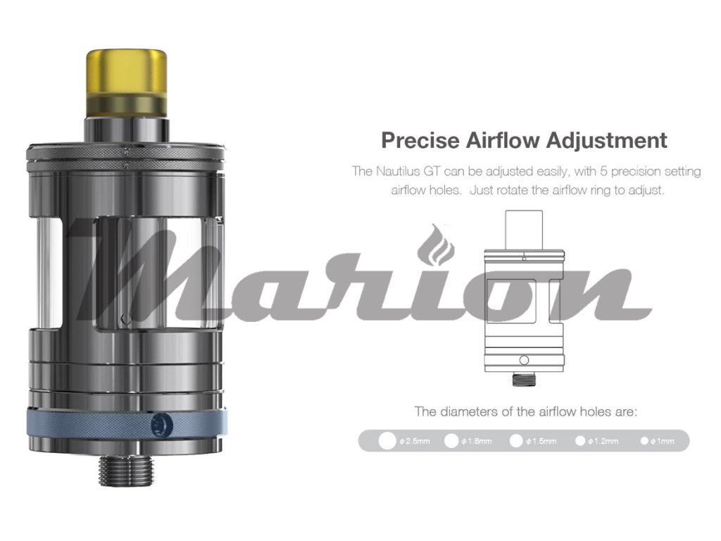 Clearomizer aSpire Nautilus GT je postaven na kvalitní základně z ušlechtilé oceli, která je doplněna o kvalitní pyrexové sklo. Celkový objem pro náplň tak činí až 3ml zásobního prostoru. Nastavitelný přívod vzduchu (Airlow) je samozřejmostí, a to v dokonalém provedení, které je přesně odstupňované celkem čtyřmi různě velikými průchody. Průchod vzduchu může být také celkově uzavřen. Díky tomu to provedení je Nautilus GT primárně určen pro oblíbený styl přímého potahování DL, nicméně v kombinaci se správně zvolenou žhavící hlavou a při vyšším omezení přívodu vzduchu lze snadno použít i pro klasický styl MTL, kdy potahujete jako z klasické cigarety. Vše završuje tolik oblíbený systém horního plnění, kdy stačí pootočit horní částí Clearomizeru a jednoduchým způsobem jí vytáhnout. K dispozici jsou dva dostatečně velké plnící otvory, kterými se plnění stane rychlou a jednoduchou záležitostí. K případné výměně žhavící hlavy stačí odšroubovat spodní základnu a samotné výměně už nic nebrání.