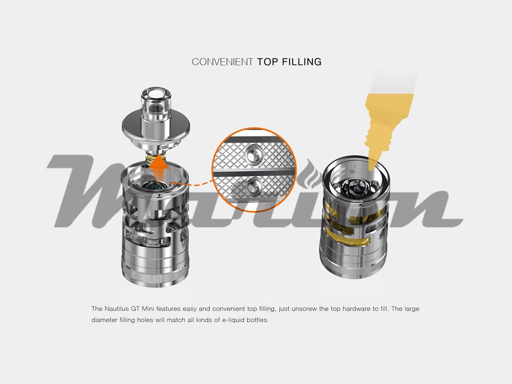 aSpire Nautilus GT Mini osloví především příznivce klasického MTL šlukování. Je postaven na kvalitní základně z ušlechtilé oceli, která je doplněna o kvalitní pyrexové sklo. Celkový objem pro náplň tak činí až 2,8 ml zásobního prostoru. Nastavitelný přívod vzduchu (Airlow) je samozřejmostí, a to v dokonalém provedení, které je přesně odstupňované celkem pěti různě velikými průchody. Průchod vzduchu může být také celkově uzavřen. Díky tomu to provedení je Nautilus GT Mini primárně určen pro klasický styl potahování MTL, jaký známe u klasických cigaret, nicméně v kombinaci se správně zvolenou žhavící hlavou a při plném otevření přívodu vzduchu lze snadno použít i pro přímý styl potahování do plic (DL). Vše završuje tolik oblíbený systém horního plnění, kdy stačí pootočit horní částí Clearomizeru a jednoduchým způsobem jí vytáhnout. K dispozici jsou dva dostatečně velké plnící otvory, kterými se plnění stane rychlou a jednoduchou záležitostí. K případné výměně žhavící hlavy stačí odšroubovat spodní základnu a samotné výměně už nic nebrání.