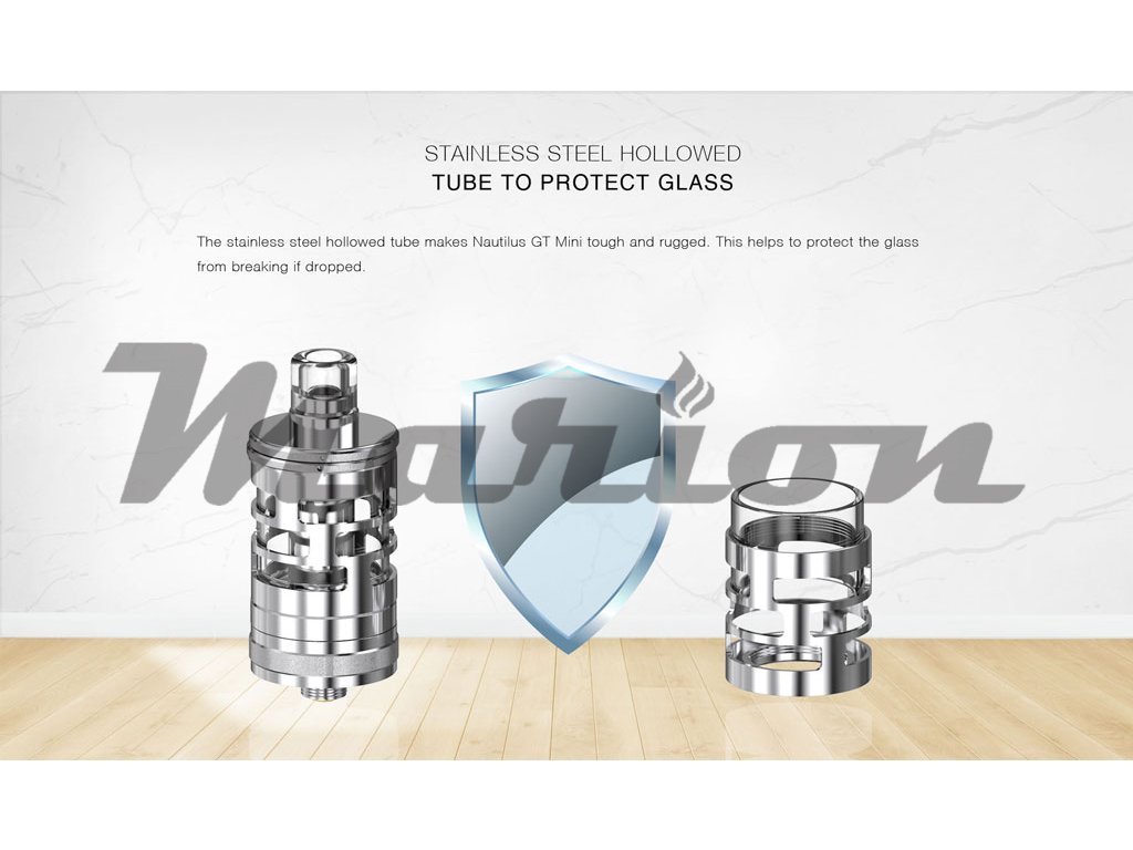 Kvalitní konstrukce Clearomizer aSpire Nautilus GT Mini je postaven na kvalitní základně z ušlechtilé oceli, která je doplněna o kvalitní pyrexové sklo. Celkový objem pro náplň tak činí až 2,8ml zásobního prostoru |