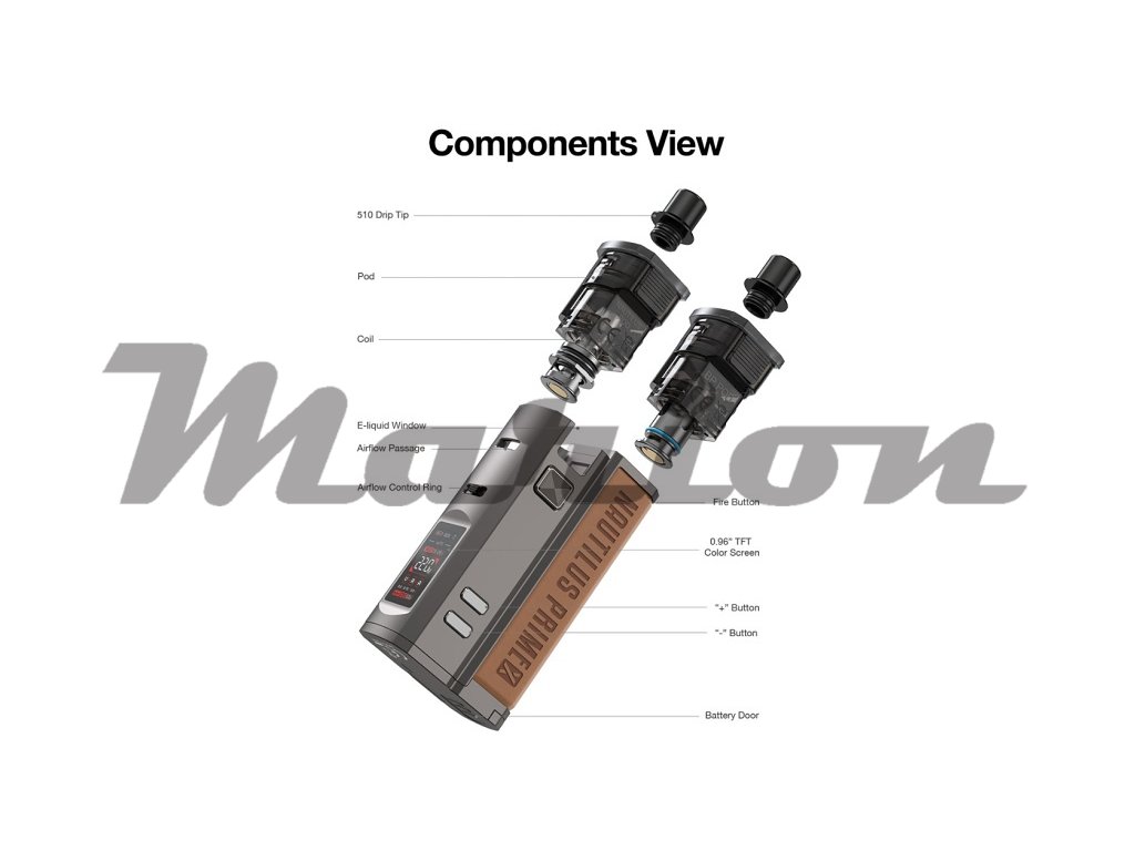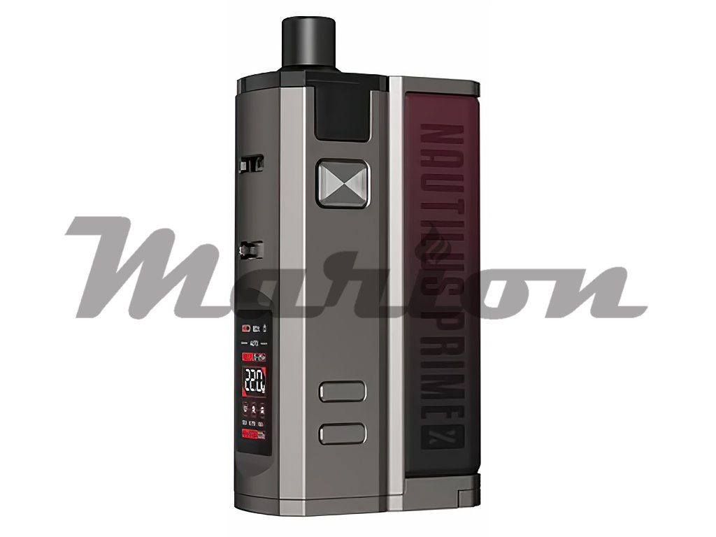 Elegantní Pod Grip na baterie typu 18650, regulace přívodu vzduchu, zinková slitina, USB-C nabíjení, výkon až 60W, režimy VV, VW, Bypass, Auto, čip ASP, TFT displej. Kompatibilní se žhavícími hlavami Aspire Nautilus a Aspire BP Coil. MTL, RDTL, a DTL styl vapování. Pod cartridge Nautilus Prime X.