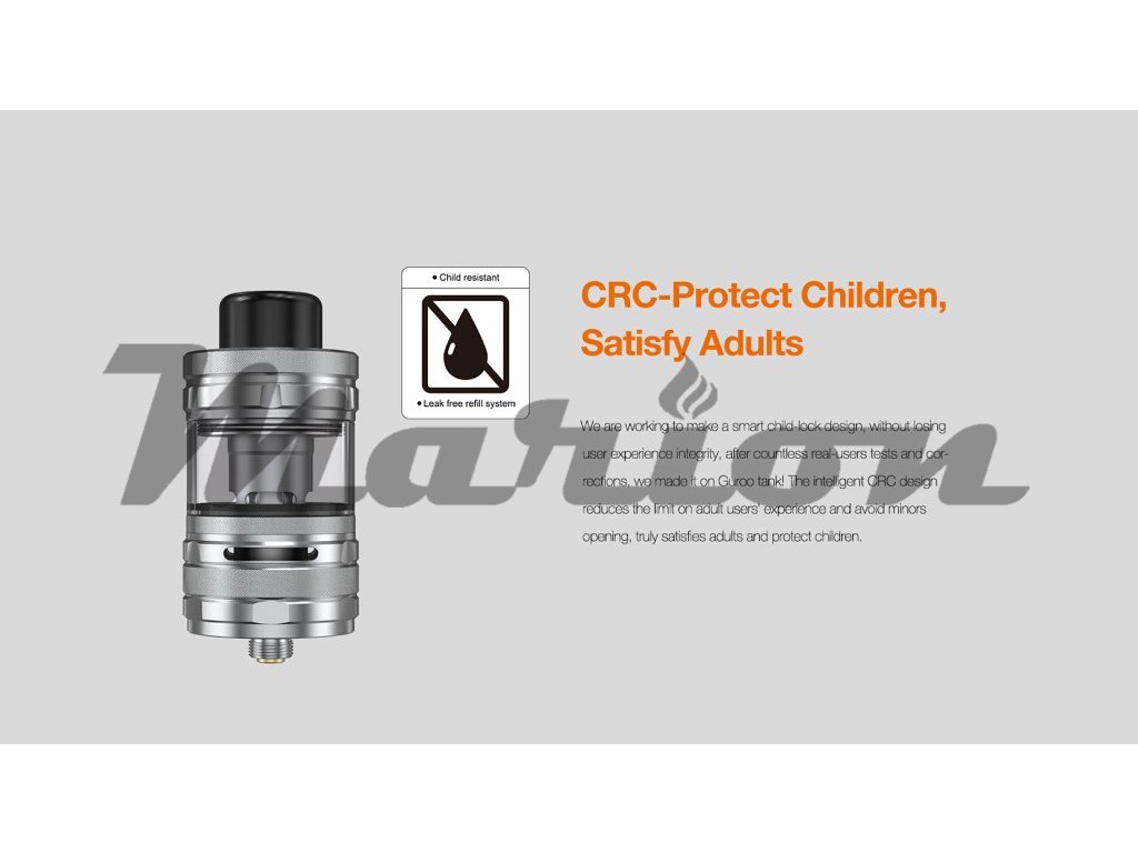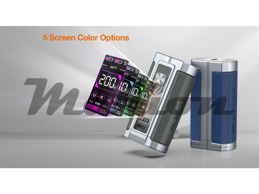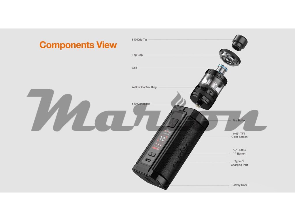 Vysoce výkonný Grip na dvě baterie typu 18650 ze zinkové slitiny a kůže. Výkon až 200W, režimy VW, VV, Bypass, TC, TCR, CPS, počítadlo potahů, možnost změny barvy TFT displeje, závit 510, USB-C nabíjení, ASP čip s řadou ochranných prvků. Clearomizer Aspire Guro 4-5 ml součástí SETU.