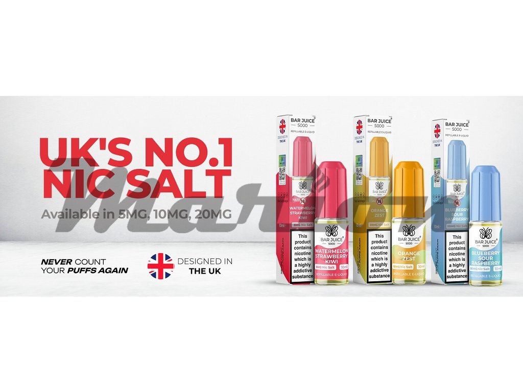 Bar Juice 5000 představuje nejprodávanější řadu e-liquidů s nikotinovou solí ve Velké Británii, inspirovanou chutěmi populárních jednorázových elektronických cigaret. Každá 10ml lahvička obsahuje 10mg/ml nikotinové soli a je vyrobena zkušenými profesionály z prémiových surovin pro nepřekonatelnou chuť a konzistenci. S vyváženým poměrem VG/PG 50/50 a formulí Nic.Salt poskytují tyto e-liquidy jemný vdech a rychlý nikotinový hit, ideální pro MTL vapování. Dostupné ve třech silných koncentracích - 5mg, 10mg a 20mg, nabízejí více než 40 autentických chutí od oblíbených jako Watermelon, Blue Razz Lemonade až po různé exotické kombinace. Náplně Bar Juice 5000 jsou vyráběny ve Velké Británii pod přísnou kontrolou kvality, což zaručuje konzistentní kvalitu a chuť. Díky bezpečnostním uzávěrům odolným proti dětem a ekologickému přístupu představuje levnější a udržitelnější alternativu k jednorázovým elektronickým cigaretám. Jedná se o perfektní volbu pro vapery, kteří hledají autentickou chuť jednorázových zařízení v opakovaně použitelném formátu s možností výběru síly nikotinu podle individuálních potřeb.