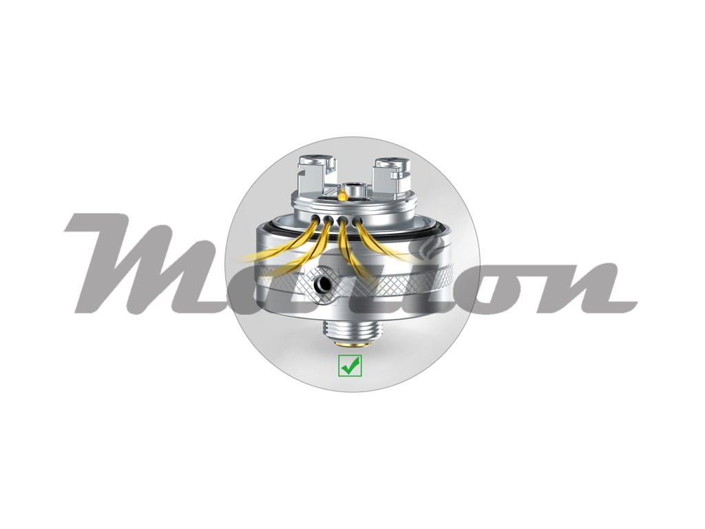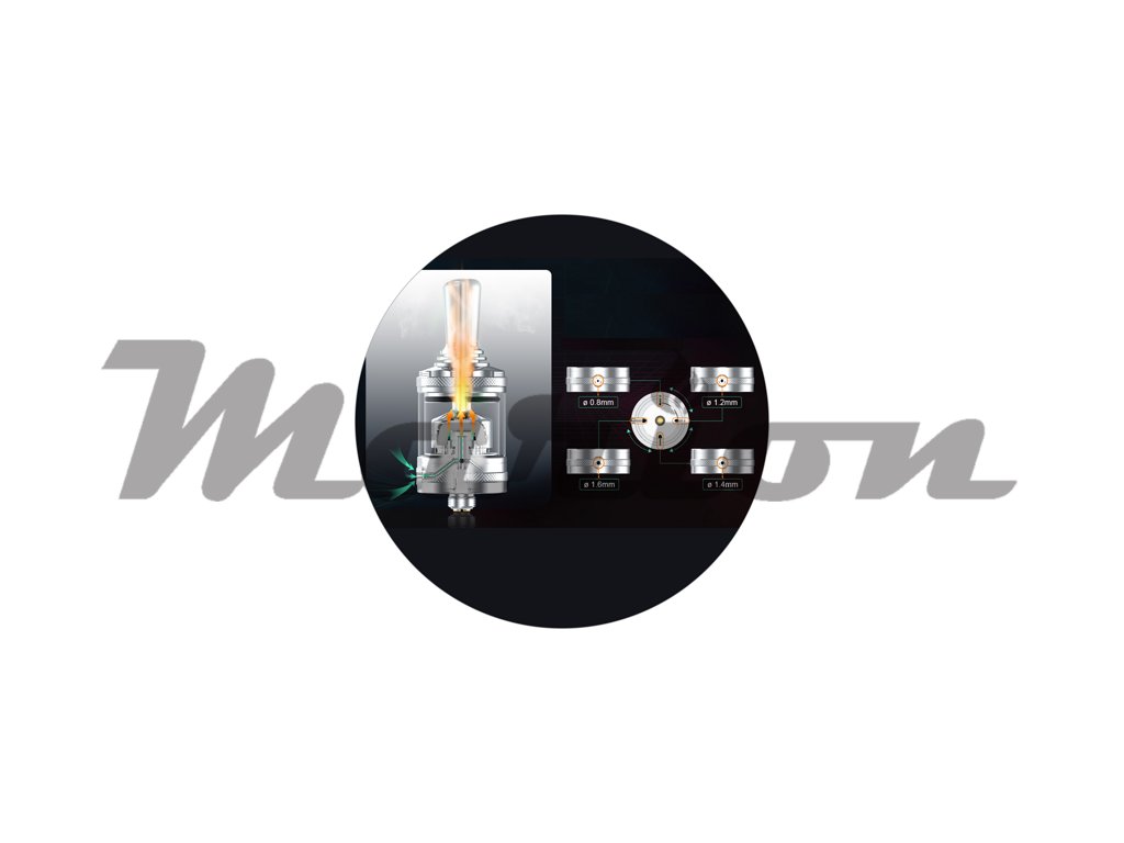 Propracovaný a intuitivní systém proudění vzduchu je jedním z klíčových prvků celého atomizéru. Na těle se nachází celkem čtyři nezávislé a individuální otvory pro přívod vzduchu s průměry 0,8 mm, 1,2 mm, 1,4 mm a 1,6 mm. Prostým otáčením kroužku pro regulaci airflow si tak zvolíte požadovaný průměr vzduchového otvoru a můžete si vychutnat tuhost potahu přesně podle svých představ.