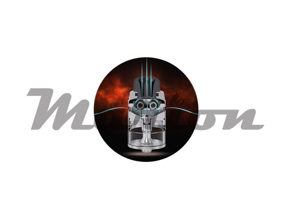 Verze V4 atomizéru Pyro přináší přepracovaný a promyšlený systém airflow. Ten je umístěn ve vrchní části a efektivně ofukuje instalované spirálky v krátké dráze, díky čemuž získáte při každém potahu plnou a výraznou chuť ve spojení s obrovskou produkcí páry. Systém airflow je plně regulovatelný, pohodlně si tak budete moci nastavovat také samotnou tuhost potahu.