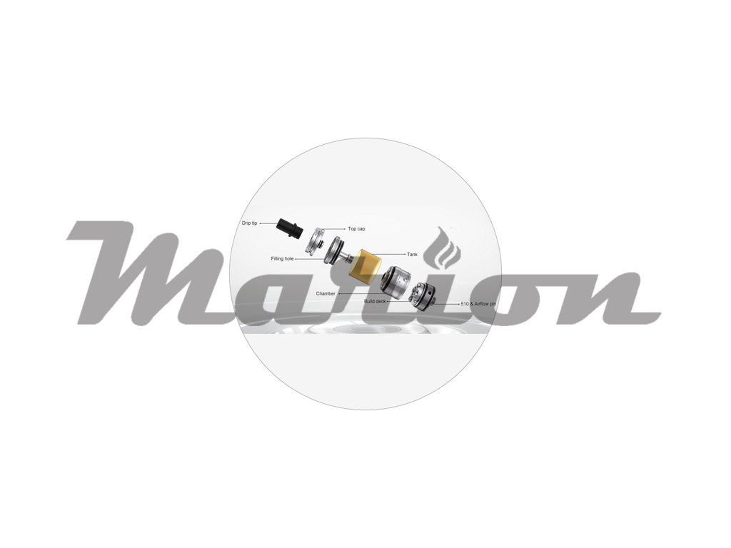V jádru clearomizéru Alberich MTL RTA na vás čeká stylová základna se dvěma protilehlými sloupky, která umožňuje hladkou instalaci jedné spirálky dle vlastního výběru. Kontakty pro usazení spirálky nabídnou dostatek prostoru a montáž je proto nesmírně snadná a sama o sobě také jednoduchá pro začátečníky. O co nejlepší požitek z MTL potahu se postará pečlivě navržený systém airflow. Ve spodní části najdete kroužek pro regulaci přísunu vzduchu a samotnou tuhost potahu budete moci ještě vylepšit díky praktickým vzduchovým vložkám, které se instalují přímo do závitu ve spodní části. V základním balení na vás čekají vložky s průměry vzduchového otvoru 0,8 mm, 1,0 mm, 1,3 mm, 1,6 mm, 2,0 mm a 2,5 mm. Optimální přenos páry do úst obstará úzký podlouhlý náustek s uchycením typu 510 ve vrchní části. Vapefly Alberich MTL RTA je špičkový motací atomizér pro klasické šlukování, od kterého se jen tak neodtrhnete.