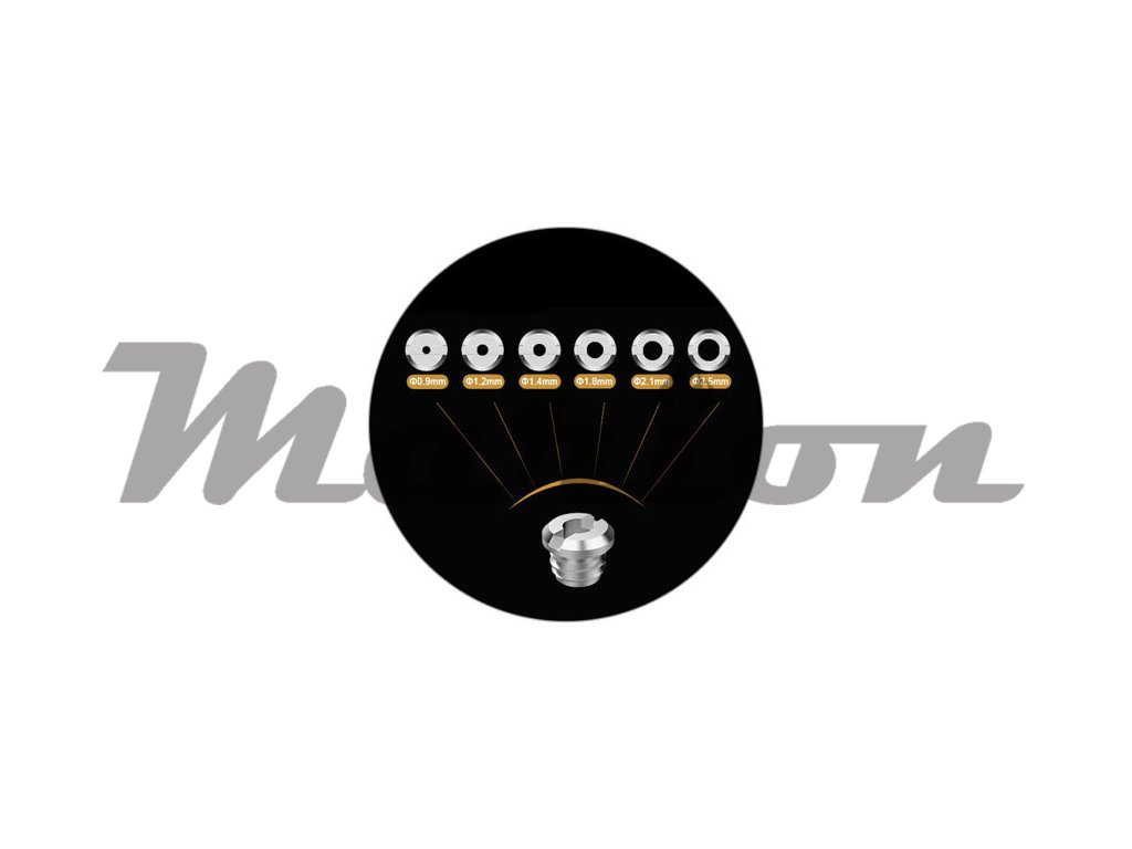 Přímo pod spirálkou se nachází otvor pro vstup vzduchu do atomizéru. Díky umístění pod spirálkou je spirálka ofukována efektivně a vždy tak dosáhnete perfektní chuti. Jelikož se jedná o MTL atomizér, připravil si výrobce široké možnosti nastavení tohoto přívodního otvoru. V balení tak najdete redukční sadu tvořenou šesti šroubky s různými průměry otvoru pro zvolení optimální tuhosti potahu. Na výběr budete mít průměry 0,9 mm, 1,2 mm, 1,4 mm, 1,8 mm a dva širší průměry 2,1 mm a 2,5 mm.
