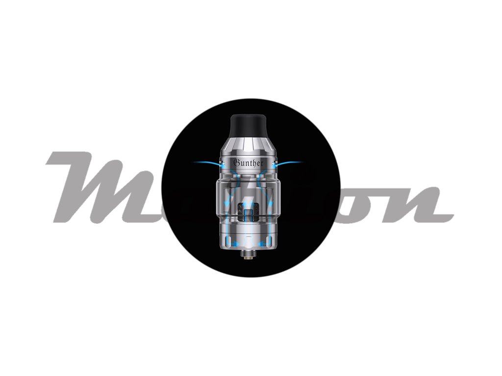 Výrobce umístil u atomizéru Gunther airflow systém do vrchní části. Díky tomu je zajištěna plynulejší cirkulace vzduchu uvnitř clearomizéru a výsledná chuť e-liquidu je potom ještě o poznání vyšší, než u atomizérů se spodním airflow systémem. Další nespornou výhodou vrchního airflow je absence možného vytečené e-liquidu v případě ucpání žhavícího tělíska.