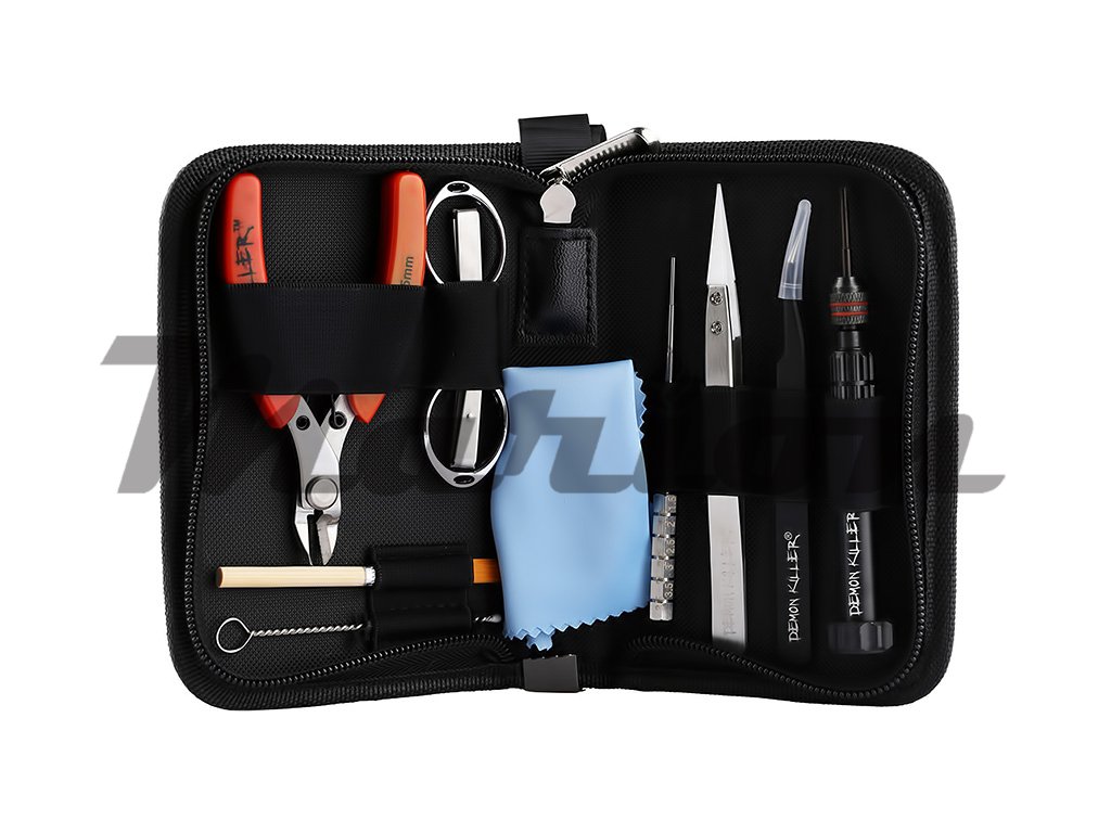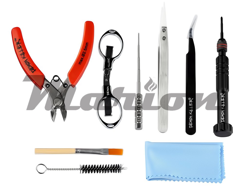Už není potřeba používat různé velké sady nástrojů. Demon Killer SET nabízí tento malý, ale velmi praktický set, se kterým se výroba, a následně samotná instalace vlastnoručně vyrobených spirálek stane rutinou. K výrobě vlastní spirály například někde na cestách Vám postačí už jen přibalit odporový drát, absorbční vatu a případně svou RBA hlavu, a můžete vyrazit v podstatě kamkoliv. Vše potřebné k tomuto úkonu totiž naleznete právě v tomto setu. Od kleští na štípání odporového drátu, přes pinzety s různými konstrukčními vlastnostmi, nůžkami na stříhání vaty, až po samotnou namotávačku vlastních spirál. SET nářadí Demon Killer totiž obsahuje vše potřebné.