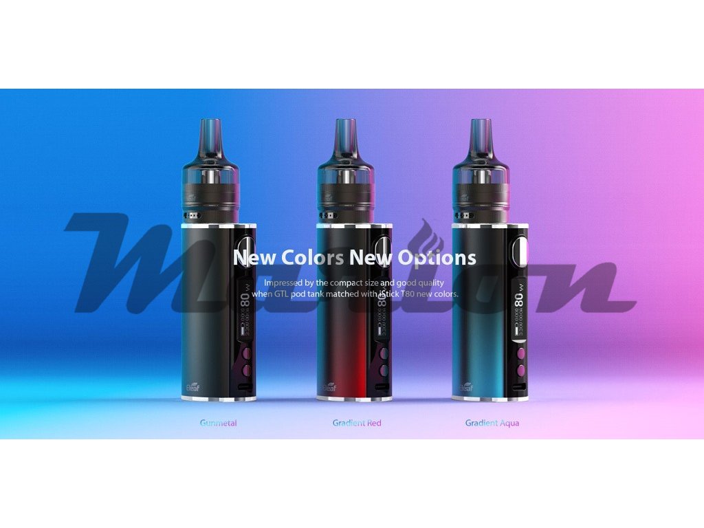Oblíbený Eleaf iStick T80 ve zcela novém barevném provedení se zcela novým Pod Clearomizérem Eleaf GTL. Vestavěná baterie o kapacitě 3000mAh, rychlé USB-C QC3.0 nabíjení, vysoký výkon až 80W, OLED displej, ochrana proti zkratu, přehřátí, přežhavení, nízkému odporu, 10-ti vteřinová ochrana žhavení. Clearomizér GTL Pod se závitem 510, objem 4,5ml, regulace Airflow, vhodný pro DL vapování, 2x žhavící hlava Eleaf GTL v SETU. Barevné provedení Gunmetal.