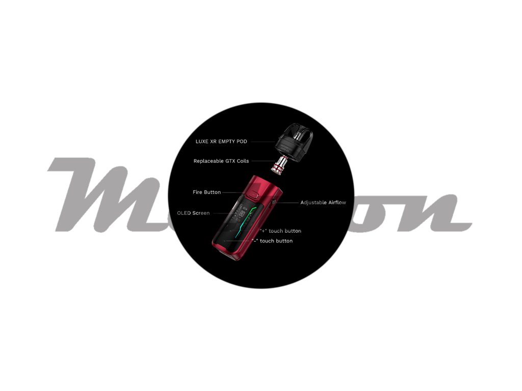 V přední části se potom nachází hlavní ovládací panel tvořený velkým spínacím tlačítkem, skrytými dotykovými regulačními tlačítky a displejem s bočním podsvícením ovládacího panelu. Uvnitř e-cigarety na vás čeká inteligentní čipset AXON, který umožňuje pohodlné a rychlé nastavení všech požadovaných hodnot. E-cigareta nabídne praktickou regulaci výkonu v rozpětí 5 - 80 W, nebo případně využití funkce SMART, při jejíž aktivaci nastaví zařízení doporučený výkon dle odporu tělíska a omezí rozsah možného použitého výkonu, aby nedošlo k poškození hlavy. Ve vrchní části je potom na tělo baterie nasazena cartridge LUXE XR s objemem 5 ml a pohodlným spodním plněním. V základním balení najdete novou cartridge Luxe XR na vyměnitelné žhavící hlavy GTX. Cartridge Luxe XR DTL je vhodná pro přímé potahování do plic. Součástí jsou také dvě žhavící hlavy s odpory 0,2 a 0,4 ohm. Vaporesso LUXE XR MAX Pod Kit je nabušené zařízení s obrovským výstupním výkonem a esteticky dokonalým designem, se kterým se nebudete ani na vteřinu nudit.