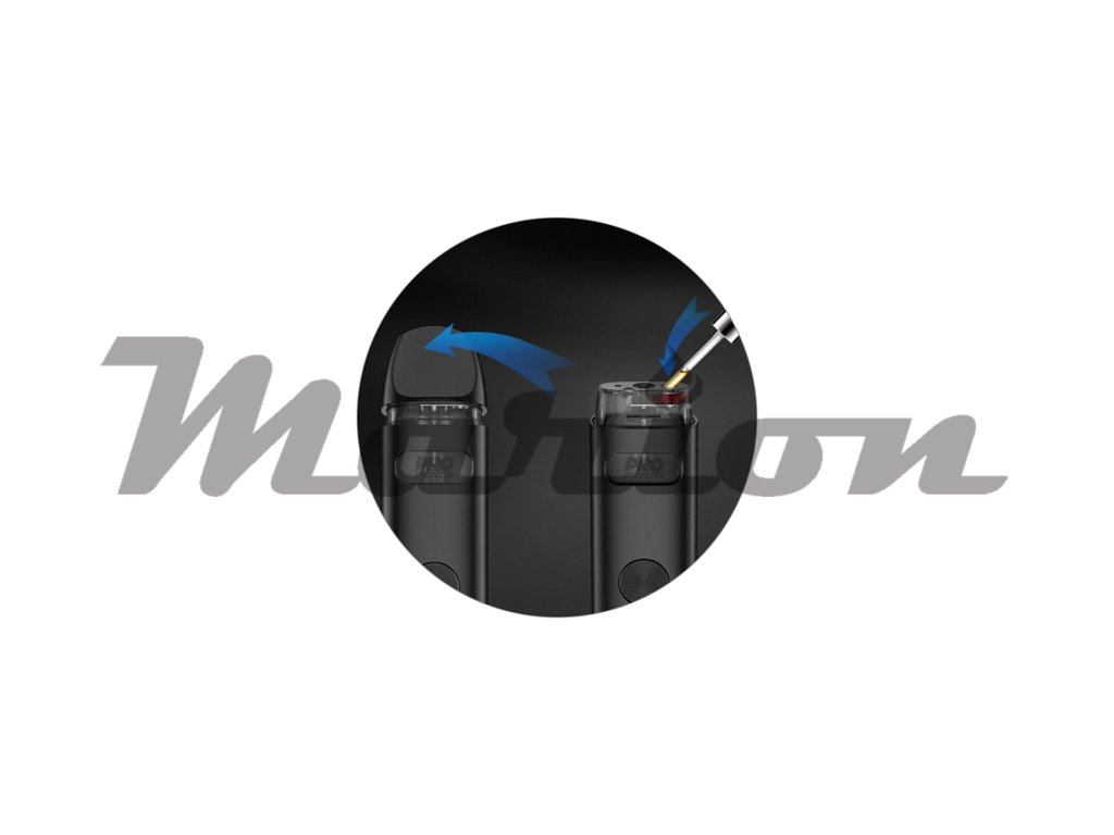 Cartridge ve vrchní části nabídne objem 2 ml. Její nespornou výhodou je potom jednoduchý mechanismus plnění. Jednoduše postačí odklopit náustek ve vrchní části a začít ihned plnit. Celý proces plnění zabere jen pár vteřin a cartridge nebudete muset během plnění ani odpojovat od těla baterie. S touto metodou si můžete e-cigaretu bez problému doplnit kdekoliv a kdykoliv.