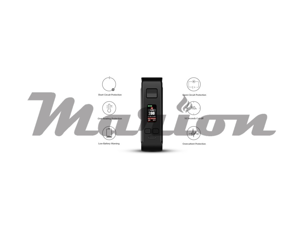 Díky perfektnímu čipu v těle modu je zajištěn bezchybný a bezproblémový chod celého zařízení. Nesmí chybět ani celá řada bezpečnostních prvků, které ochrání váš mod, baterie i váš atomizér. K dispozici je ochrana proti zkratu, proti přehřátí čipu, proti vysokému proudu, nebo proti nízkému napětí. Nesmí chybět ani pojistka proti dlouhému potahu.