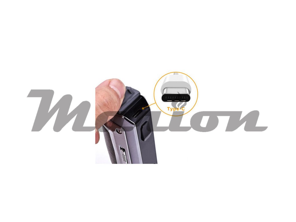 Ve spodní části se nachází šroubovací uzávěr, který ukrývá slot pro jednu baterii typu 18650. Po vložení baterie je možné začít využívat mod naplno. Díky pohonu na jednu externí baterii je zajištěn vysoký výstupní výkon a rychlý náběh žhavení. Baterie není součástí balení a je nutné dokoupit ji k modu samostatně. Baterii 18650 je možné dobíjet přímo v modu díky USB-C portu na těle.