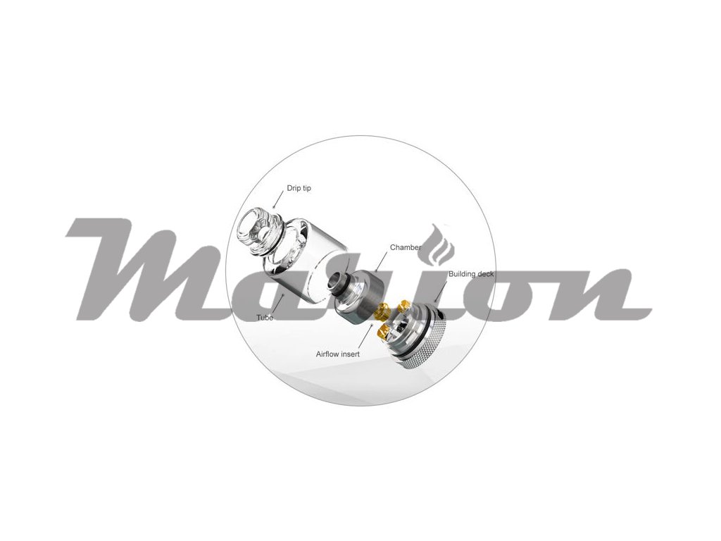 Ve spodní části se nachází neregulovatelný airflow systém, který doplňuje vnitřní vzduchová vložka. Ta se nachází přímo pod spirálkou a dá se dle potřeby měnit. V balení najdete čtyři vložky s různými průměry pro různou produkci páry. Všechny vložky nabídnou širší průměr, atomizér se zaměřuje na uživatele přímého potahování do plic (DL).