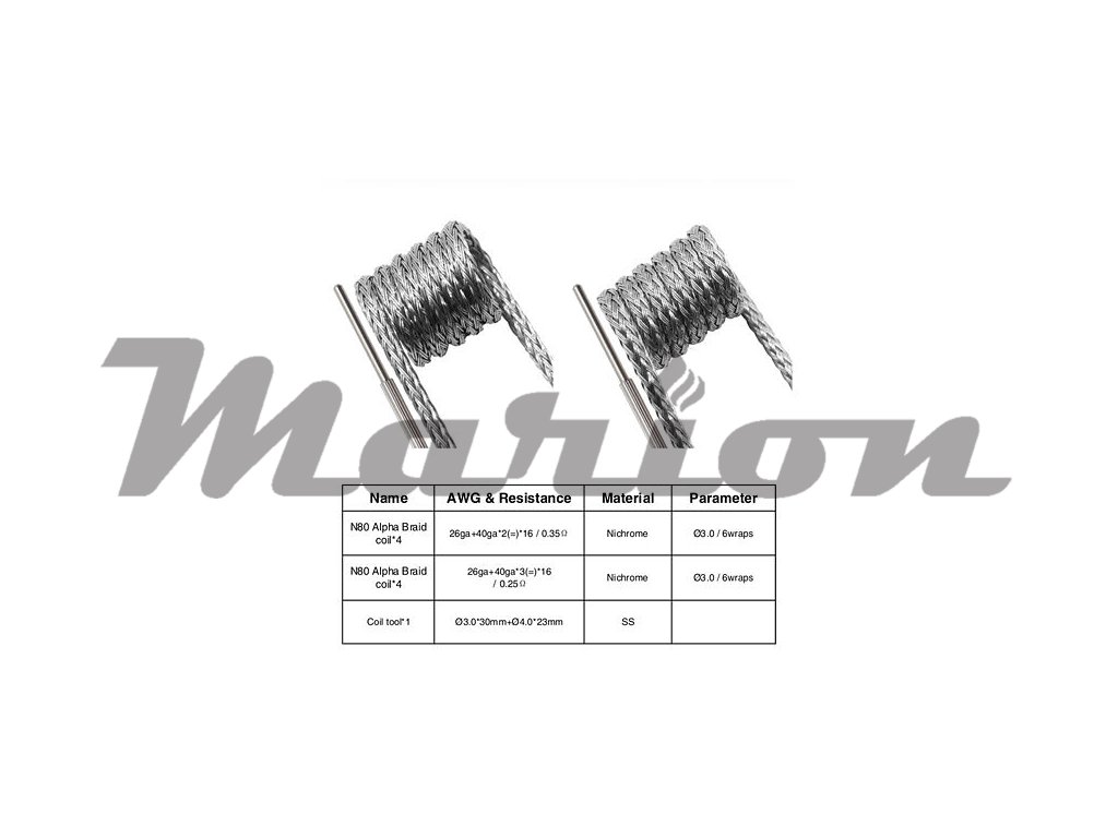 4x Předmotaná spirálka N80 Alpha Braid 26GA + 40GA*3(=)*16, vnitřní průměr spirálky 3 mm, odpor 0.25 ohm, šest otoček