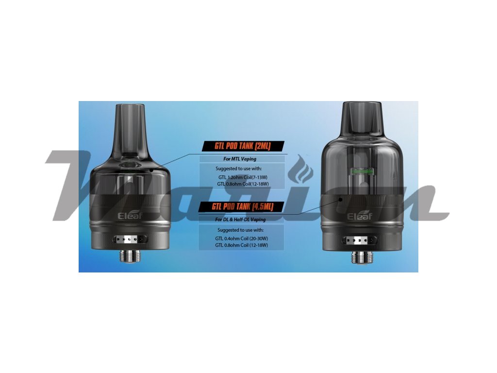 Není určeno pro náplně obsahující nikotin! Clearomizer GTL Pod s klasickým 510 závitem je praktický clearomizer od společnosti Eleaf. Plastové tělo PCTG se základnou z nerez oceli pojme až 4,5ml liquidu a je vhodný pro DL vaping. V základním balení budete mít na výběr dvě žhavicí hlavy, a to GTL o odporu 0,4ohm a 0,8ohm. Regulace přívodu vzduchu pro nastavení optimální kouřivosti se nachází ve spodní části.