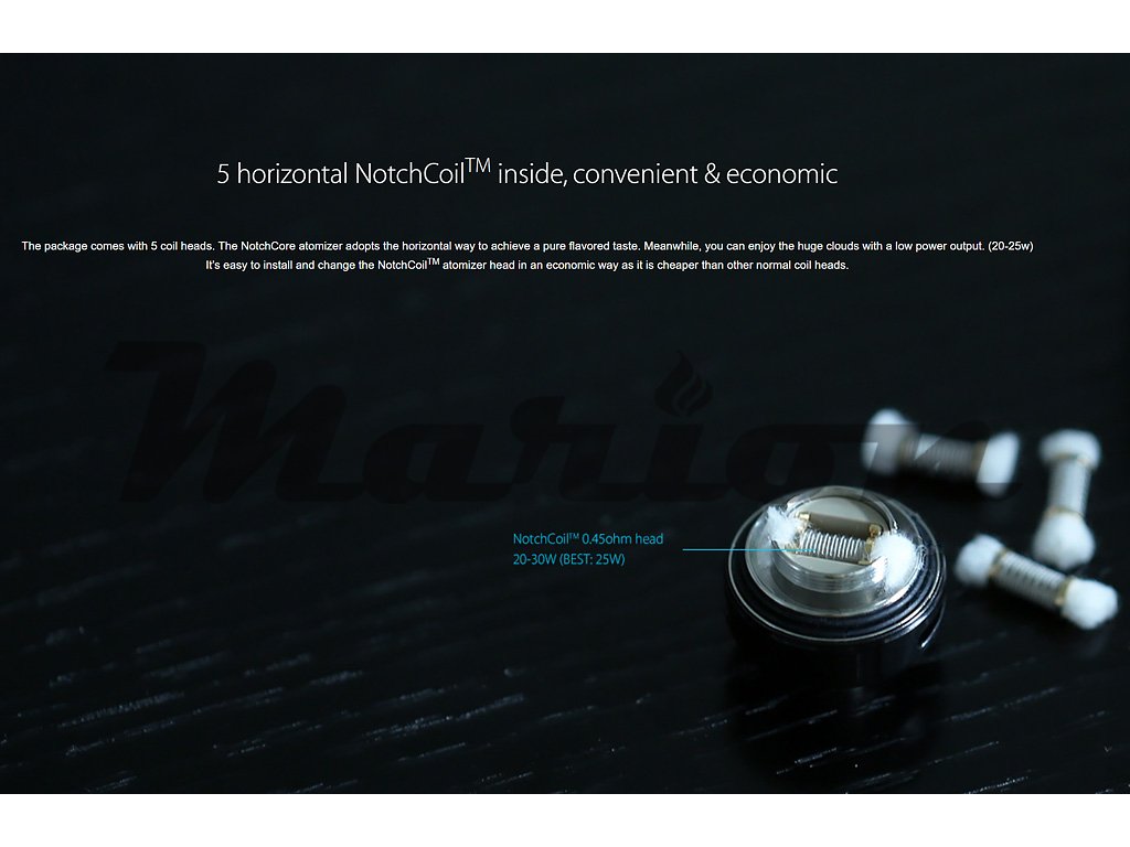 Náhradní žhavící spirálka Joyetech NotchCoil s velkou plochou pro odpařování e-liquidu, určená pro přímé potahování do plic (DL). Kompatibilní s Clearomizéry Joyetech NotchCore aj. Celkový odpor 0,45ohm, doporučený výkon 20-30W.