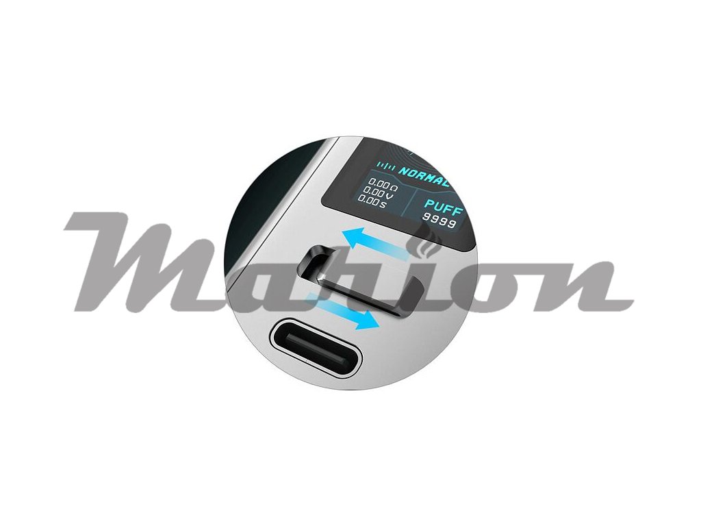 Po odklopení bočního panelu modu Centaurus M100 objevíte slot pro vložení vlastní baterie typu 18650. Díky pohonu na externí baterii si mod dokáže poradit s ohromujícím výstupním výkonem, jenž se zastavil až na 100W. Svou vlastní baterii budete moci pohodlně nabíjet přímo v modu, grip M100 disponuje slotem pro připojení kabelu USB-C a pro rychlé dobití proudem až 2A.