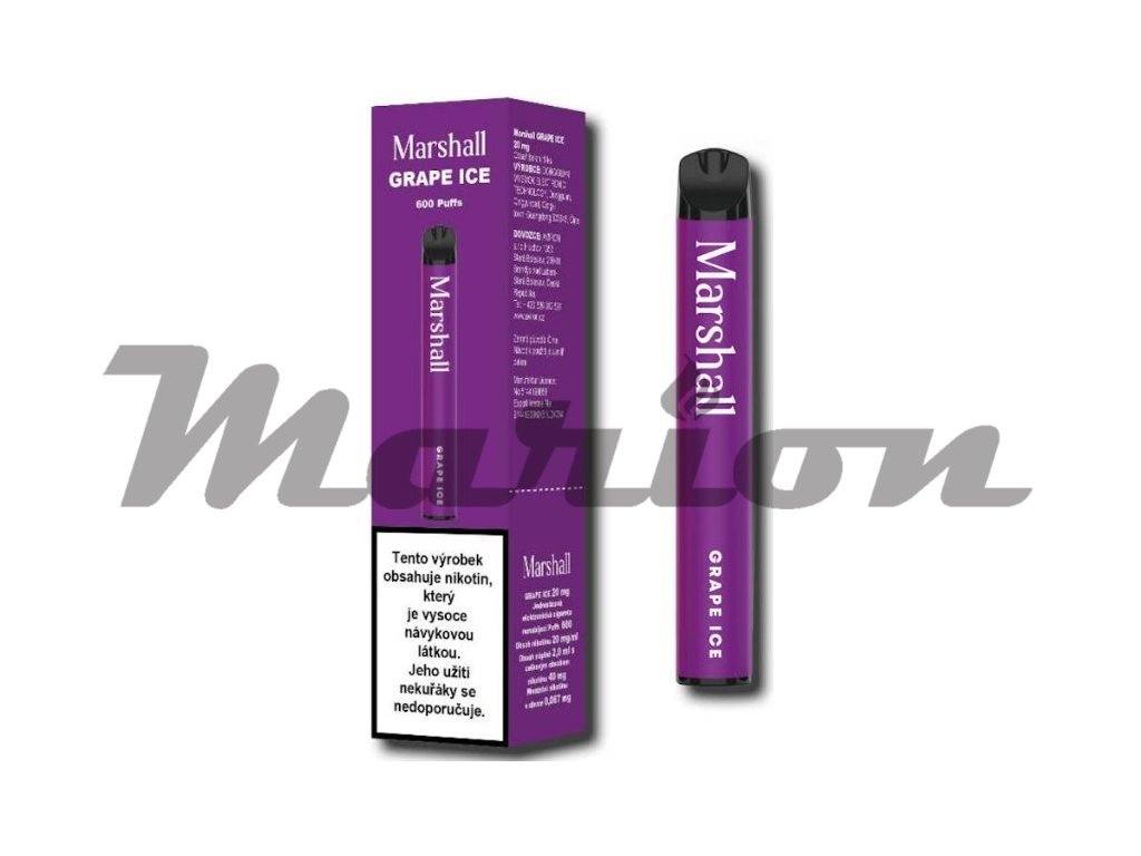 Hroznové víno s ledovou dochutí... Marshall je stylová jednorázová e-cigareta pro ty, kteří hledají bohatý a přesto jemný zážitek z každého potažení, plné chuti i nikotinu. Zařízení disponuje vestavěnou baterií o kapacitě 400mAh a cartridgí o objemu 2ml s obsahem nikotinu 20mg