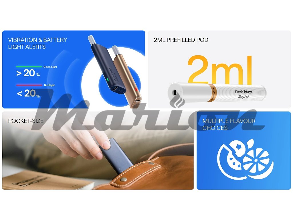 - 11 dostupných předplněných příchutí v 2ml cartridgích