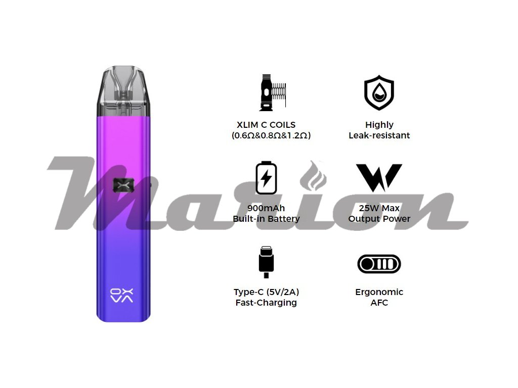 OXVA představuje elektronickou cigaretu Xlim C, která tuto oblíbenou řadu Pod systémů posouvá o další level výš. Příjemný ergonomický tvar baterie v 10-ti barevných zpracování nabízí integrovaný monočlánek o kapacitě 900mAh s rychlým USB-C nabíjením (80% za pouhých 30 minut). Spínací tlačítko je vybaveno LED indikátorem stavu nabití. Xlim C disponuje Photonovým čipem, který automaticky upraví výkon dle odporu žhavící hlavy. Na boční straně baterie je umístěno regulační tlačítko pro přívod vzduchu, díky kterému si jednoduše nastavíte RDL nebo MTL režim vapování. V obsahu balení nalezneme prázdnou cartridge o objemu 2ml s vyměnitelnými žhavícími hlavami o odporu 0,6ohm a 0,8ohm, avšak je plně kompatibilní s cartridgemi Xlim V2.