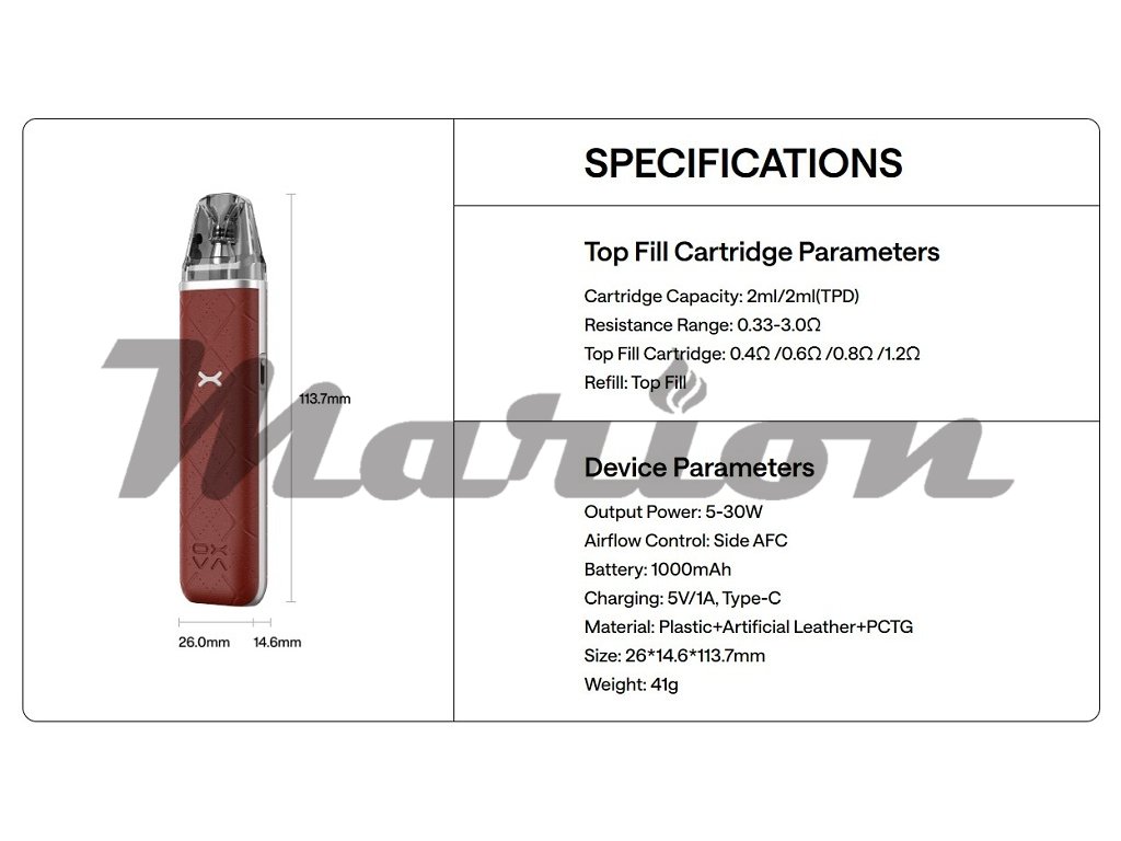 Parametry a specifikaceRozměry: 113.7 x 26 x 14.6 mm Kapacita baterie: Integrovaná 1000 mAh Režimy: Bypass Metody spínání potahu: Automatická aktivace potažením Výstupní výkon: 5-30 W (dle použité Pod Cartridge) Podporovaný odpor: dle kompatibilní Pod Cartridge Způsob nabíjení: USB-C port (5V/1A) Regulace výkonu: Automaticky Objem Pod Cartridge: 2 ml Styl potahování: MTL, RDL Odpor žhavících hlav v balení: 0,8Ω Regulace přívodu vzduchu (Airflow): Ano (stupňovaná) Hmotnost: 41 g Barva: Graffitti Black (Černá) Materiál: Umělá kůže + PCTG + plast |