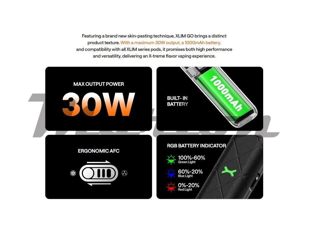 Díky jednoduchému magnetickému systému vložení Cartridge je možná její rychlá výměna. Pod systém je vyrobený z kvalitních materiálů, což zaručuje odolnost a dlouhou životnost zařízení. Oxva Xlim Go je kompatibilní téměř se všemi cartridgemi řady Xlim. Elegantní design s povrchovou úpravou z kombinace kůže a kovu dodává zařízení luxusní vzhled a plynulé nastavení průtoku vzduchu (Airflow) vám umožňuje regulovat sílu a hustotu vdechovaného kouře. Automatická aktivace žhavení potahem a snadné použití dělají z OXVA Xlim Go ideální volbu pro začátečníky i zkušené vapery. Celkově je OXVA Xlim Go ideální volbou pro uživatele, kteří hledají kompaktní a výkonné zařízení pro každodenní vaping. Díky své jednoduché obsluze a elegantnímu designu je ideální volbou pro začátečníky i pokročilé uživatele. S širokým spektrem funkcí a možností nastavení výkonu je možné tento pod systém plně přizpůsobit individuálním preferencím každého uživatele.