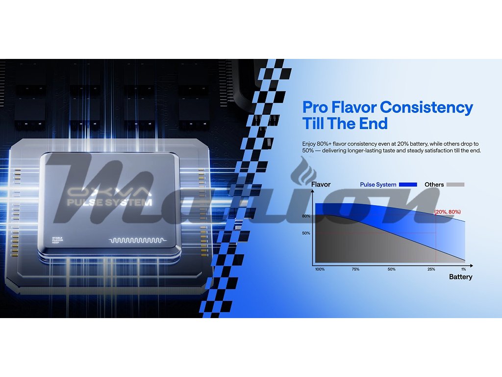 Pulse SystemRevoluční Pulse System s inteligentním Photon čipsetem zajišťuje stabilní výstupní výkon od 5 do 30 wattů napříč celým rozsahem nabití baterie. Pokročilá pulzní technologie udržuje konzistenci chuti na úrovni 80% i při 20% zbývající kapacity baterie, což eliminuje slabé potahy typické pro běžná zařízení. |