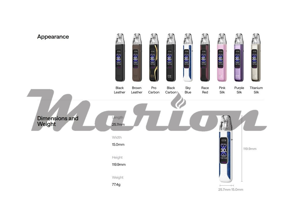 Prémiový designOXVA XLIM Pro 3 disponuje robustní konstrukcí z vysoce kvalitní zinkové slitiny v kombinaci s odolným PCTG plastem pro pody. Klasický zploštělý pero-stylový design s jemně zaoblenými rohy zajišťuje pohodlné držení a přirozený úchop v ruce. Zařízení je dostupné v devíti atraktivních variantách včetně prémiových kožených povrchů a moderních hedvábných textur. |