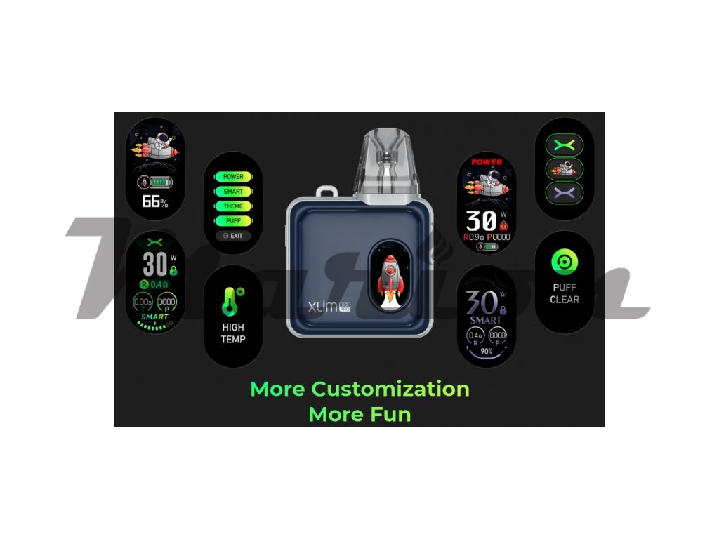 Elektronická cigareta OXVA Xlim SQ Pro je zárukou pro dokonalý vaping! Moderně zpracované tělo baterie je pokryto technologií IML (In Mold Labeling) = vícevrstvá fólie zalitá plastem, opticky téměř nerozeznatelná od výrobků z pravého kovu, ovšem s výhodami plastu. Integrovaný monočlánek o kapacitě 1200mAh disponuje rychlým USB-C nabíjením. Přední panel je obohacen o 0,96palcový barevný TFT displej (Thin Film Transistor) pro snadné nastavení a zobrazení hodnot včetně zábavné tapety displeje. OXVA Xlim SQ Pro nabízí režimy Power a Smart o maximálním výkonu až 30W. Tvorbu páry zajišťuje systém automatického žhavení - stačí pouze potáhnout z náustku. Na boční straně baterie je umístěno regulační tlačítko pro přívod vzduchu, díky kterému si jednoduše nastavíte RDL nebo MTL režim vapování. V obsahu balení nalezneme cartridge Xlim V3 s bočním plněním. Lze však použít i cartridge Xlim V2.