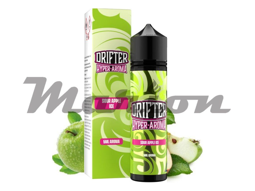 Jemně kyselé zelené jablíčko... Prémiové britské příchutě Drifter Hyper s vysokou koncetrací aroma. Jsou dodávány v 60ml lahvičkách, které obsahují 5ml koncentrátu. Uživatel tak pouze přidá bázi do lahvičky, zatřese s ní a má hotový e-liquid.Výroba probíhá za nejpřísnějších hygienických standardů ve farmaceutické laboratoři. Jedná se o koncentrát, který se kape do báze. Příchuť může být použita pouze jako aroma do bází....nejedná se o hotový liquid