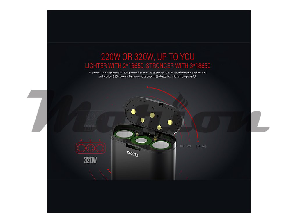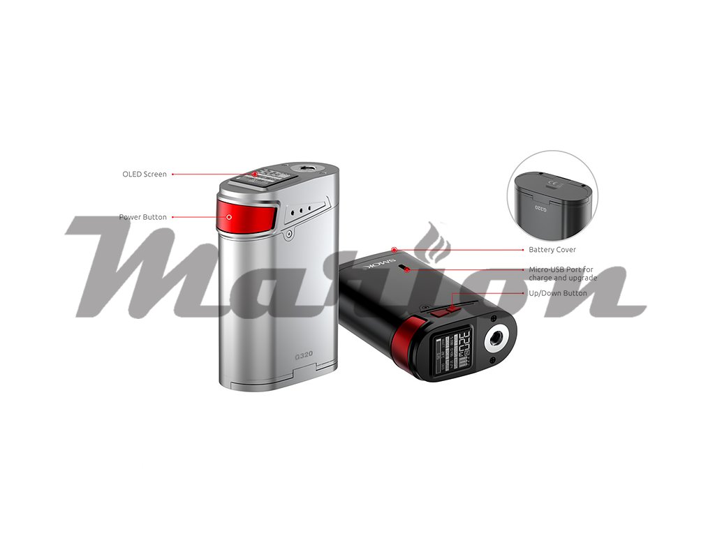 Smoktech G320 Marshal patří mezi menší přístroje pro vaping, ale svým výkonem až 320W se z něj stal bezkonkurenční vítěz mezi vysokovýkonnými gripy. I přes svůj malý rozměr (89,5mm x 61,5mm x 31mm) využívá tři monočlánky typu 18650 (min. 25A), avšak lze použít monočlánky pouze dva, a to s maximálním výkonem až 220W. Vedle klasického VW režimu Marshal disponuje i teplotními mody TC-Ni/Ti/SS a TCR. V horní části je velký OLED displej, který Vás informuje o aktuálním výkonu, teplotě, napětí, odporu, proudu, režimu, počtu potahování a kapacitě baterie bez jakéhokoliv přepínání. Nabíjení umožňuje micro USB vstup.