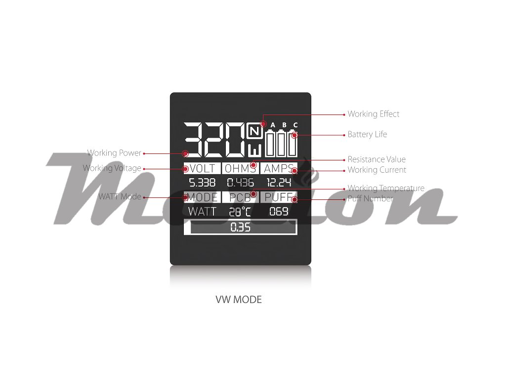 Displej: Zobrazení stavu nabití, odporu atomizeru, aktuální výkon, teplota, napětí, režim, počítání počtu potahů