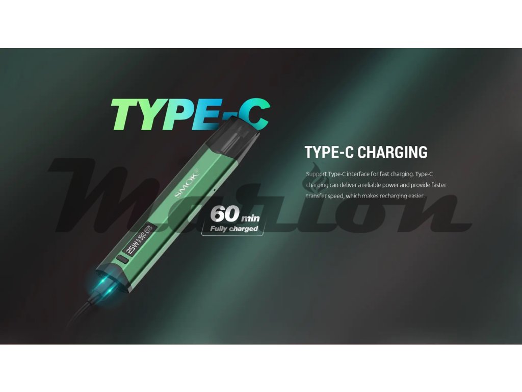 O nabíjení elektronické cigarety se postará vestavěný moderní USB-C konektor a plné nabití trvá dle výrobce cca 1 hodinu.