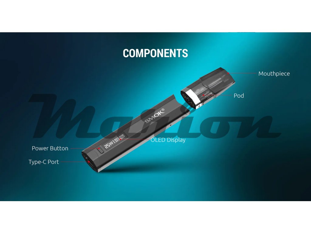 Samozřejmostí je pak Pod Cartridge sloužící jako zásobník pro Vaší oblíbenou náplň (e-liquid), která v tomto případě slouží zároveň i jako náustek a nosič samotné žhavící hlavy. V tomto případě se jedná o dvouspirálkovou žhavící hlavu s celkovým odporem 0,8Ω se kterou si maximálně vychutnáte Váš oblíbený e-liquid. Tato Pod Cartridge s uvedeným odporem vytváří opravdu solidní dým a je vhodná ke klasickému způsobu potahování (MTL) jako u klasických cigaret. Je nutné také dodat, že tato Cartridge má velmi solidní objem vzhledem k malým rozměrům e-cigarety, a to rovné 3ml. Její plnění je velmi snadné a provádí se sejmutím boční silikonové krytky. Její instalace je velmi jednoduchá a provádí se pouhým zasunutím do těla cigarety a o její správné držení se postará dvojice zabudovaných magnetů. Stav hladiny je díky průhlednosti Cartridge dobře vidět, a tak vždy vidíte, jak na tom aktuálně jste a jestli můžete třeba vyrazit na celodenní výlet.