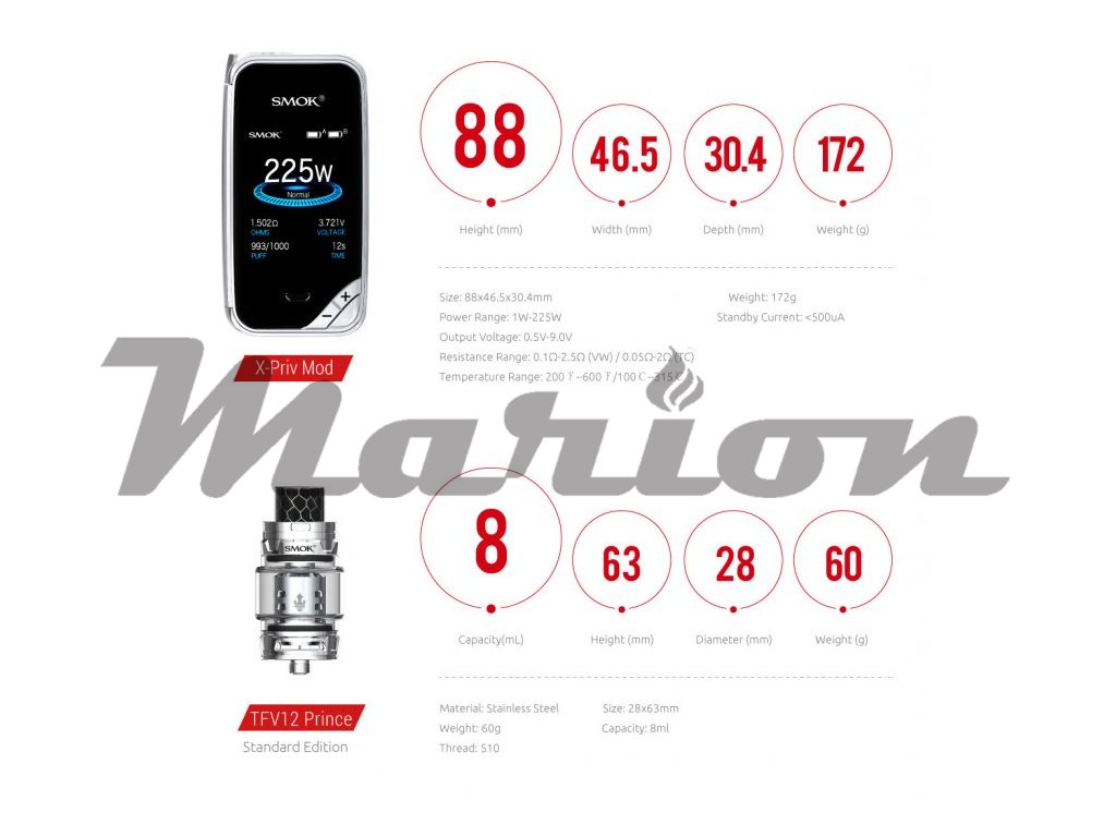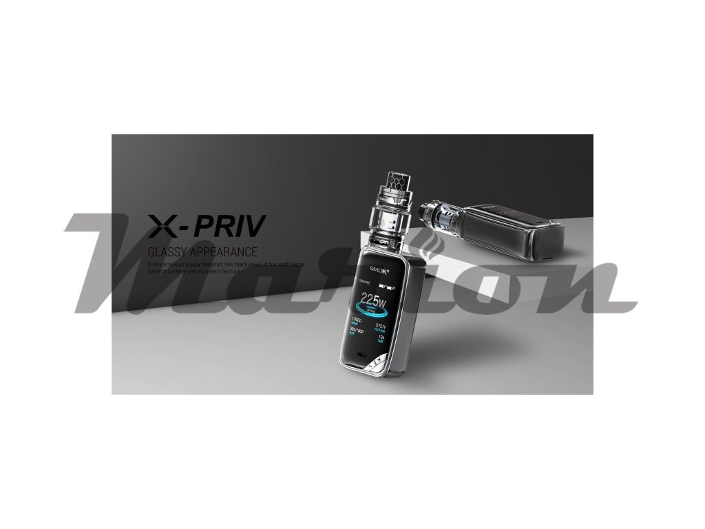 V jednoduchosti je síla. Tímto mottem se nechal inspirovat Smoktech, který vsadil na jednoduché tvary a dle prvního dojmu se jim to vyplatilo. Stále zde nalezneme našlapaný agregát o síle až 225W poháněný 2 bateriemi 18650. Milovníci teploty si také přijdou na své, jak už bývá u dnešních gripů zvykem. X-Priv si snadno spletete s telefonem, jelikož má 2 palcový display a zabírá tak celou stranu gripu. Díky tomu je velice přehledný a vy se tak velice rychle dozvíte všechny důležité informace o nastavení a indikaci baterií. Ty lze nabíjet skrz USB konektor, přičemž Smok dodává vysoce kvalitní USB kabel, který jen přidává na dojmu luxusu. Smok tento grip osadil clearomizerem Prince s konvexní Pyrex nádržkou o objemu 8ml. Tímto spojením si tedy můžete užívat opravdu dlouhého vapování bez rušivých elementů dobíjení a doplňování liquidu. Široký výběr žhavicích hlav obstarávají čtyrspirálkové Q4 a M4, šestispirálková X6, na míru šitá RBA a monstrozní desetispirálkový výrobce páry T10.