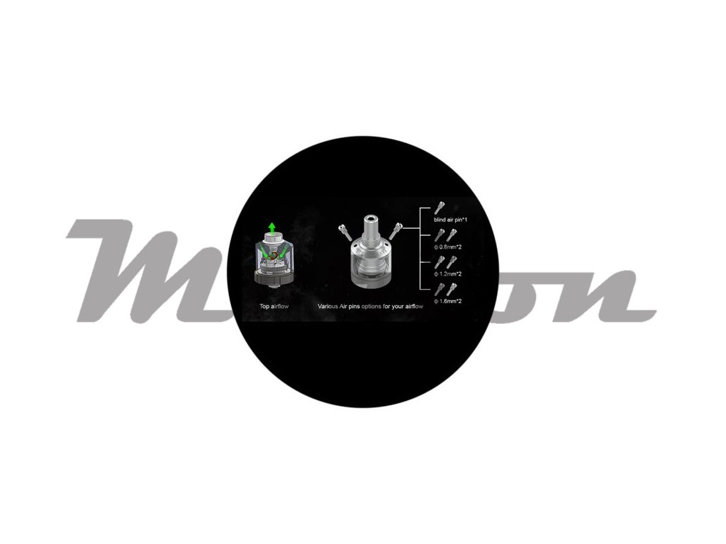 Uvnitř atomizéru se nachází základna pro jednu spirálku. Tuto vlastní spirálku snadno uchytíte pomocí dvou protilehlých šroubků, instalaci hravě zvládne naprosto každý. Instalace zabere jen několik málo minut. Clearomizér nabídne rovněž optimální tuhost potahu s možností pokročilé regulace. Airflow systém je umístěn ve vrchní části clearomizéru a tvoří ho dva otvory, které budete moci osadit speciálními vzduchovými piny. V balení se nachází hned několik pinů s různými průměry vzduchového otvoru, nebo také utěsňovací pin pro kompletní utěsnění jednoho ze dvou vzduchových otvorů. Steam Crave Mini Robot RTA je stylový a jednoduchý motací clearomizér, který zprostředkuje skvělé podání chuti a optimální produkci páry dle vašich představ.