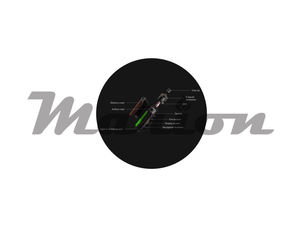 Odklopením zadního krytu objevíte slot pro vložení externí baterie. Zařízení pracuje s jednou baterií typu 18650. Díky pohonu na externí baterii je zajištěn stabilní chod zařízení, rychlý náběh žhavení a možnost využití vysokého výstupního výkonu, jež dosahuje až 80 W. Baterii si navíc kdykoliv pohodlně dobijete přímo v e-cigaretě díky portu USB-C v přední části. Lze ji dobíjet proudem až 2 A.