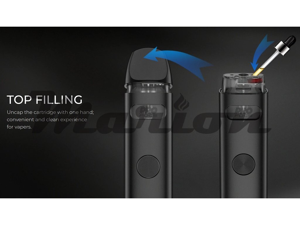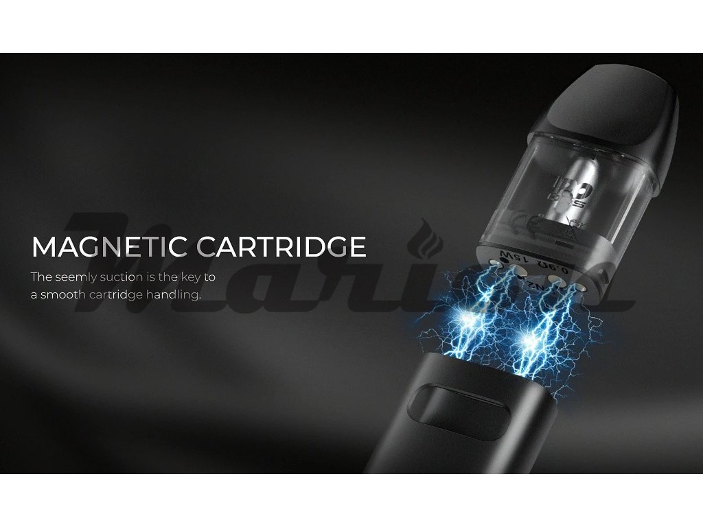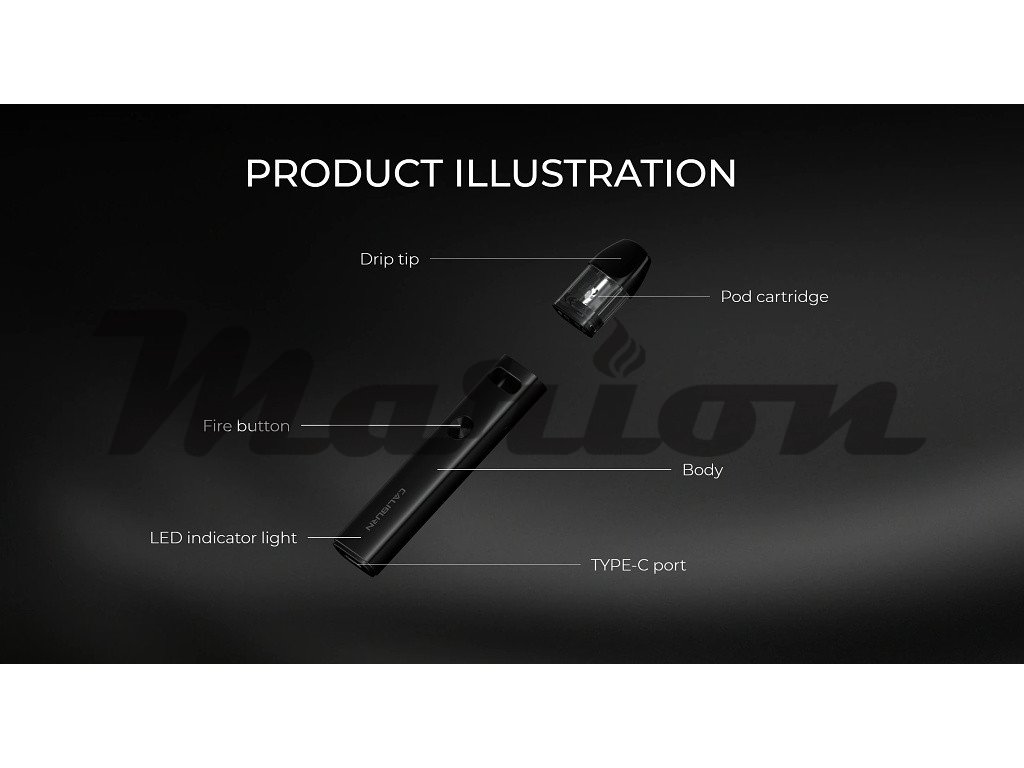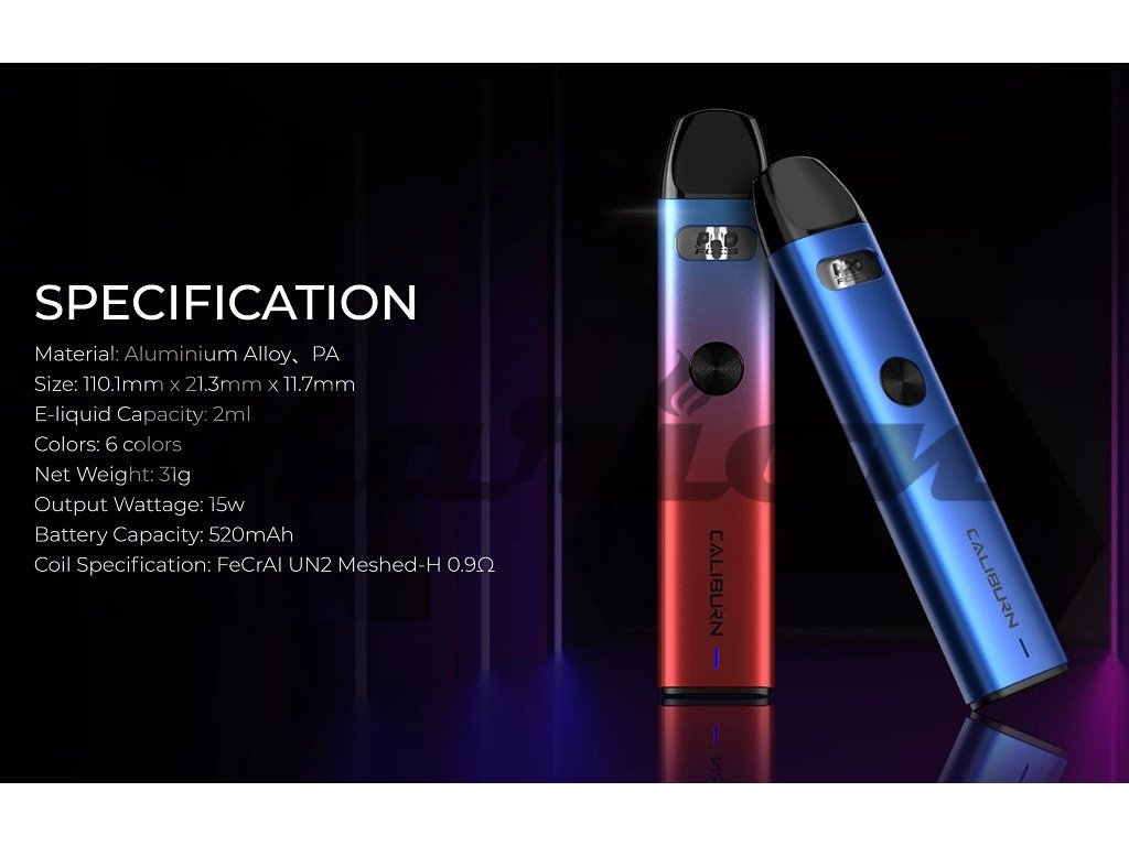 Pod elektronická cigareta vhodná pro MTL styl vapování s celkovým výkonem 15W, cartridge s objemem 2ml a Mesh žhavící hlavou s technologii kvality chuti Pro-FOCS s celkovým odporem 0,9ohm, vestavná baterie s kapacitou 520mAh, USB-C nabíjení, tělo z hliníkové slitiny, rozměry 110 x 21,3 x 11,7 mm. Možnost automatické i manuální aktivace potahu. Opakovaně plnitelná Pod Cartridge Caliburn A2.