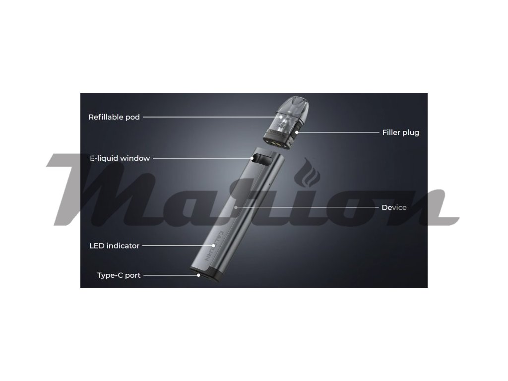Caliburn A2S se prezentuje elegantním designem, důmyslným LED indikátorem stavu nabití a především novou cartridgí A2 Mesh o odporu 1,2ohm s technologií PRO-FOCS, která díky průhlednému tělu zjednodušuje hlídání hladiny liquidu v nádržce (cartridge je plně kompatibilní s verzí A2 o odporu 0,9ohm). Integrovaná baterie o kapacitě 520mAh disponuje automatickým výkonem až 15W, nabíjení pomocí USB-C portu a LED indikátorem stavu nabití, které je umístěno v dolním nápisu Caliburn. Tvorbu páry zajišťuje systém automatického žhavení - stačí pouze potáhnout z náustku.
