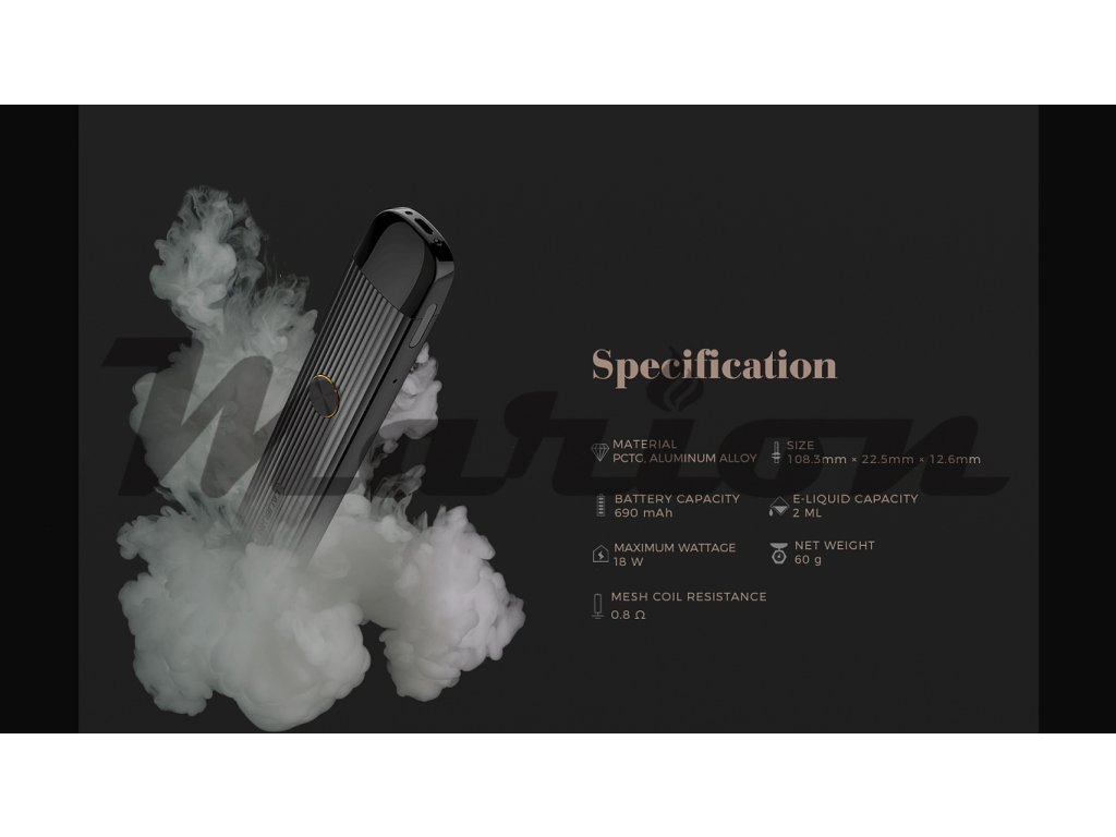 Automatická Pod elektronická cigareta s celkovým výkonem 18W, cartridge s objemem 2ml, baterie 690mAh, USB-C nabíjení, hliníkový obal.