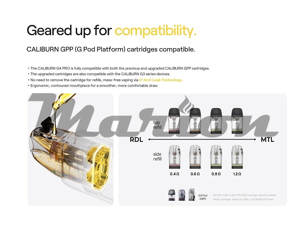 Nové cartridge Caliburn GPP s objemem 3 ml nabízejí snadné plnění ze spodní strany a průhledný materiál PCTG pro kontrolu hladiny e-liquidu. Magnetické uchycení zajišťuje pevné spojení s tělem a jednoduchou výměnu. Cartridge je možné nasadit dvěma směry, přičemž každá orientace nabízí odlišnou šířku sacího otvoru pro jemnější ladění airflow podle vašich preferencí.