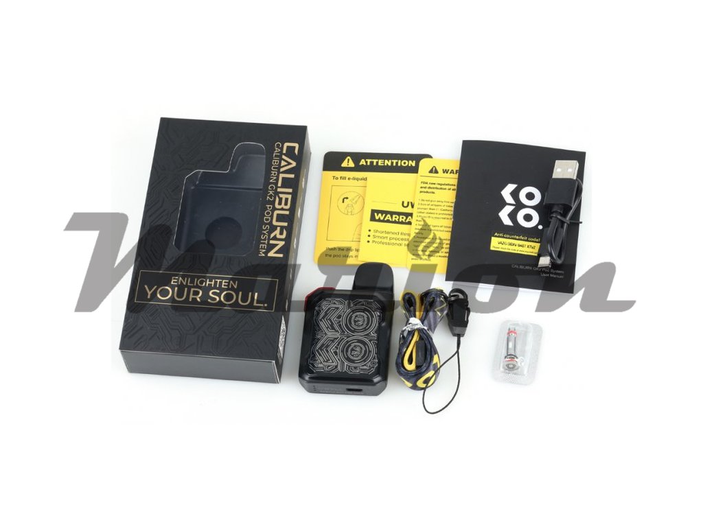 Caliburn GK2 je vylepšenou verzí řady KOKO Prime s futuristickými prvky - interakce světla a vibrace poskytuje nový způsob komunikace s uživateli. Podsvícený boční panel svítí různými barvami při různých úrovních výkonu a vibruje v různých stavech, jako je nízké napětí nebo při nutnosti výměny cartridge. Moderní USB-C port zajistí rychlé nabití. Cartridge G2 o objemu 2ml disponuje inovativní regulací přívodu vzduchu pomocí regulačního kolečka - nejlepší nastavení chuti liquidu. Žhavicí hlavy jsou kompatibilní s řadou Caliburn G.