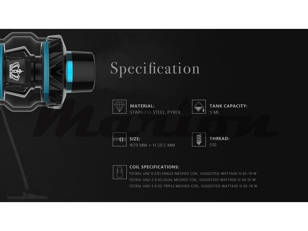 Výkonný nízkoodporový Clearomizér z nerezové oceli a pyrexu, vhodný především pro DL vapování. Objem 5ml. Podpora žhavících hlav Uwell UN2, UN2-2, Plynulá regulace přívodu vzduchu (Airflow), horní plnění e-liquidem, rozměry 50,5mm x 29mm, závit 510. 2x žhavící hlava v Setu.