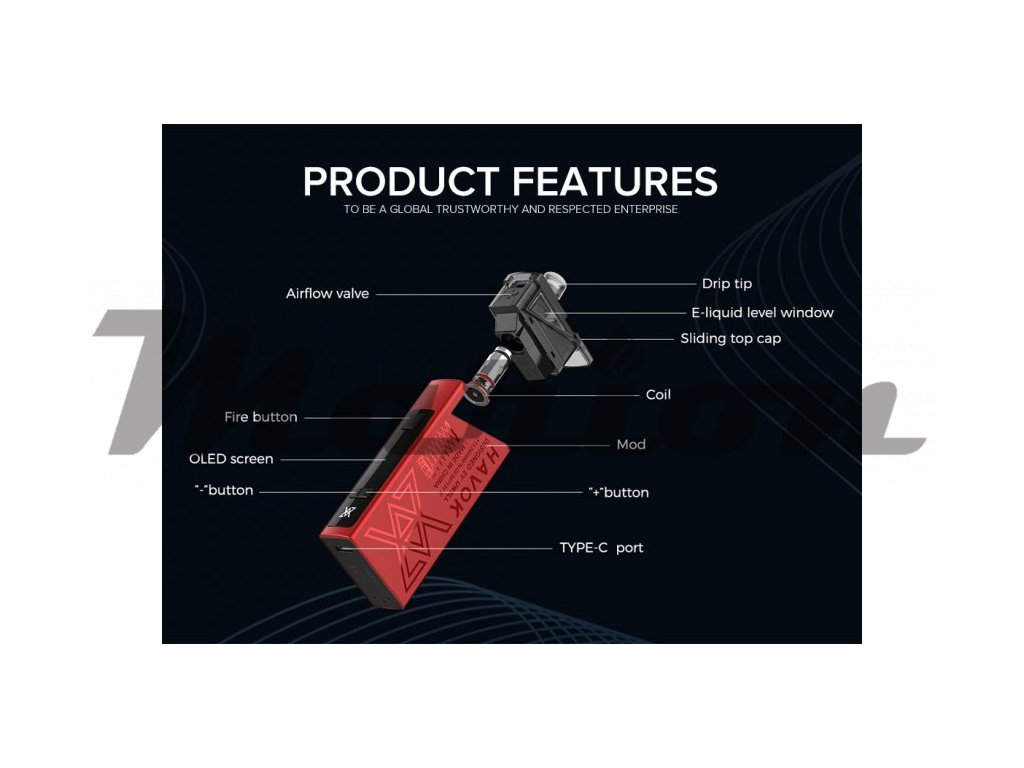 UWELL HAVOK V1 Pod je propracovaný grip s moderním designem a skvělým přenosem chuti e-liquidu. HAVOK V1 Pod disponuje vestavěnou baterií o kapacitě 1800mAh s USB-C nabíjecím portem pro rychlé nabití. Výkon až 65W se nastavuje na přehledném bočním OLED displeji. Tato sada nabízí dva typy cartridgí o objemu 4ml, a to: s horním plněním a vyměnitelnou žhavící hlavou o odporu 0,25ohm a 0,6ohm nebo s vestavěnou žhavící hlavou o odporu 0,6ohm se spodním plněním. Obě varianty jsou vybaveny bočním nastavením průchodu vzduchu pro optimální kouřivost.