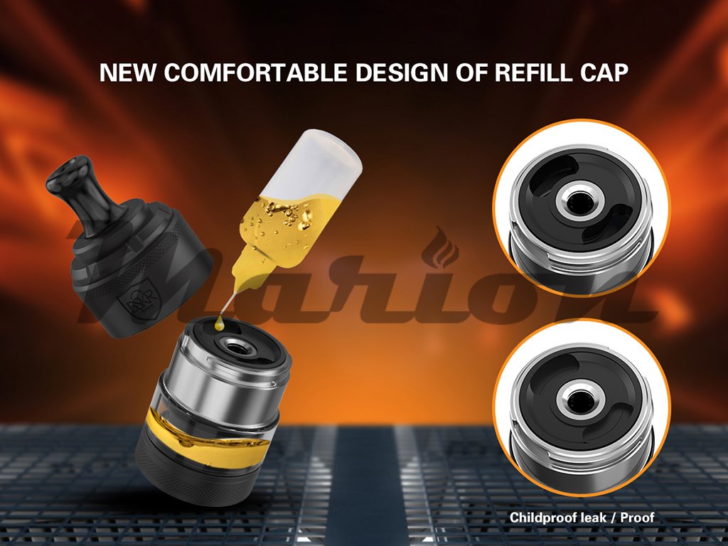 Jednoduché plnění Plnění je také velmi praktické a jednoduché a probíhá pootočením (po směru hodinových ručiček) a sejmutím horní části Clearomizeru, pod kterou se nachází dva dostatečně velké otvory pro plnění, opatřené navíc membránou, která slouží nejen jako opatření proti nenechavým dětem, ale taky jako zpětná záklopka pro nechtěné protékání liquidu do meziprostoru tanku a sacímu drip tipu. |